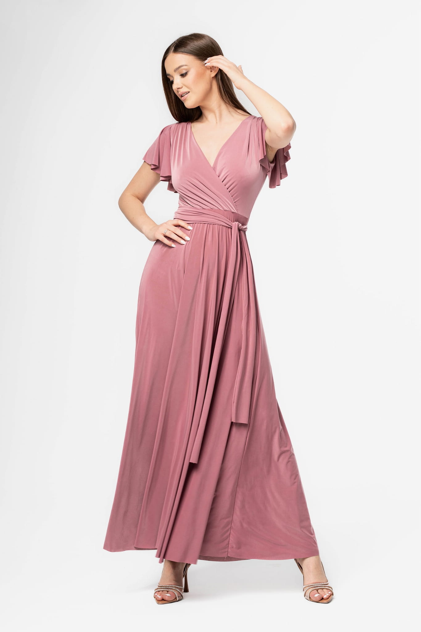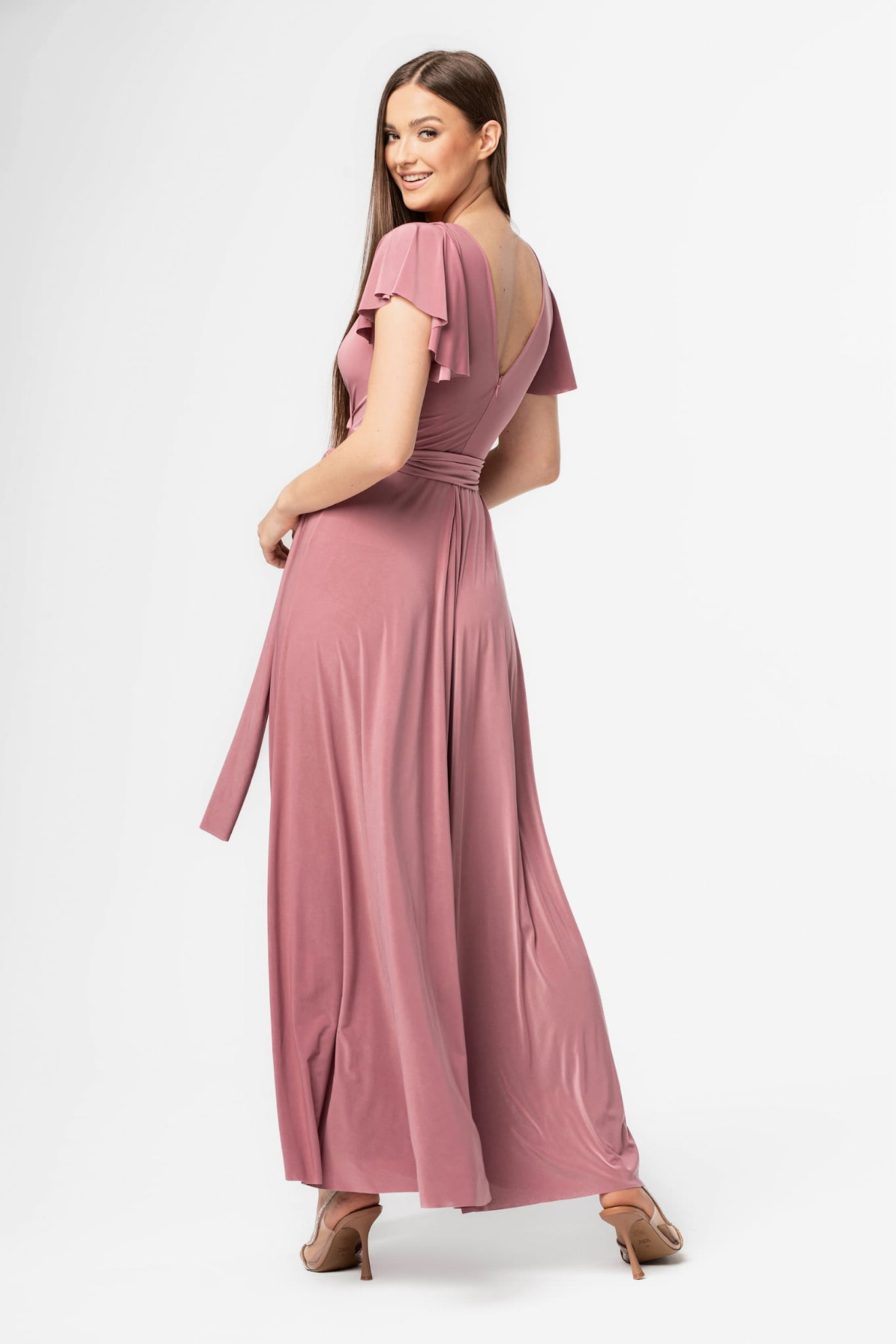 Ramiona zostały okryte motylkowymi rękawami, które perfekcyjnie współgrają z dekoltem w kształcie litery V. Delikatnie rozkloszowany dół sukienki dodaje sylwetce lekkości i wdzięku, natomiast wiązanie w pasie podkreśla wcięcie w talii. Abelia idealnie sprawdzi się na każdym eleganckim przyjęciu.