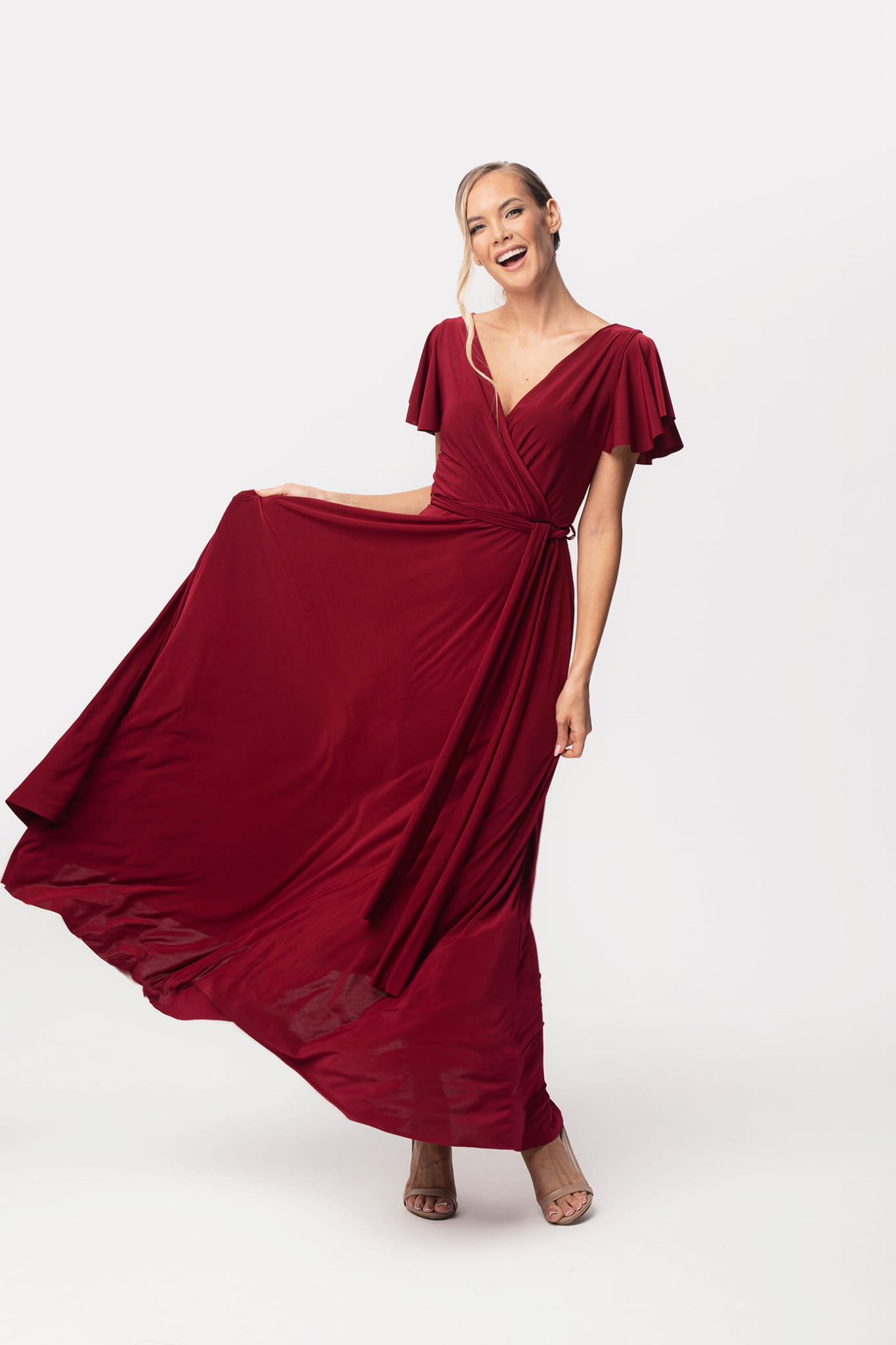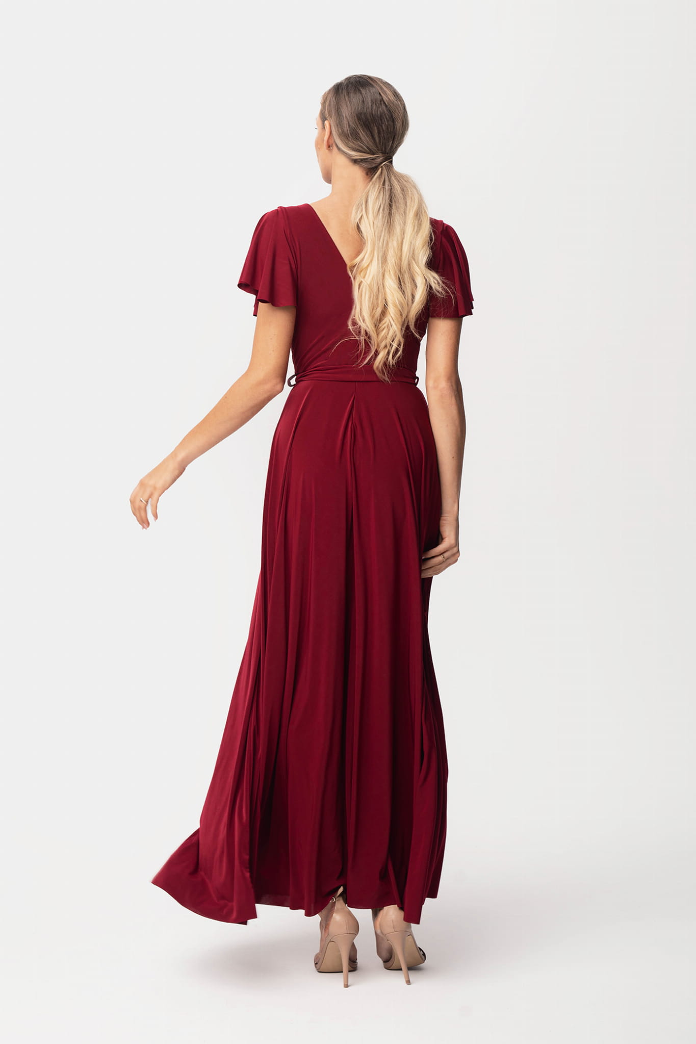 Ramiona zostały okryte motylkowymi rękawami, które perfekcyjnie współgrają z dekoltem w kształcie litery V. Delikatnie rozkloszowany dół sukienki dodaje sylwetce lekkości i wdzięku, natomiast wiązanie w pasie podkreśla wcięcie w talii. Abelia idealnie sprawdzi się na każdym eleganckim przyjęciu.