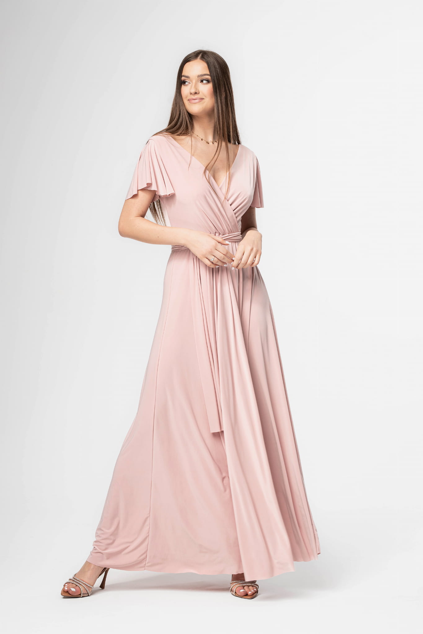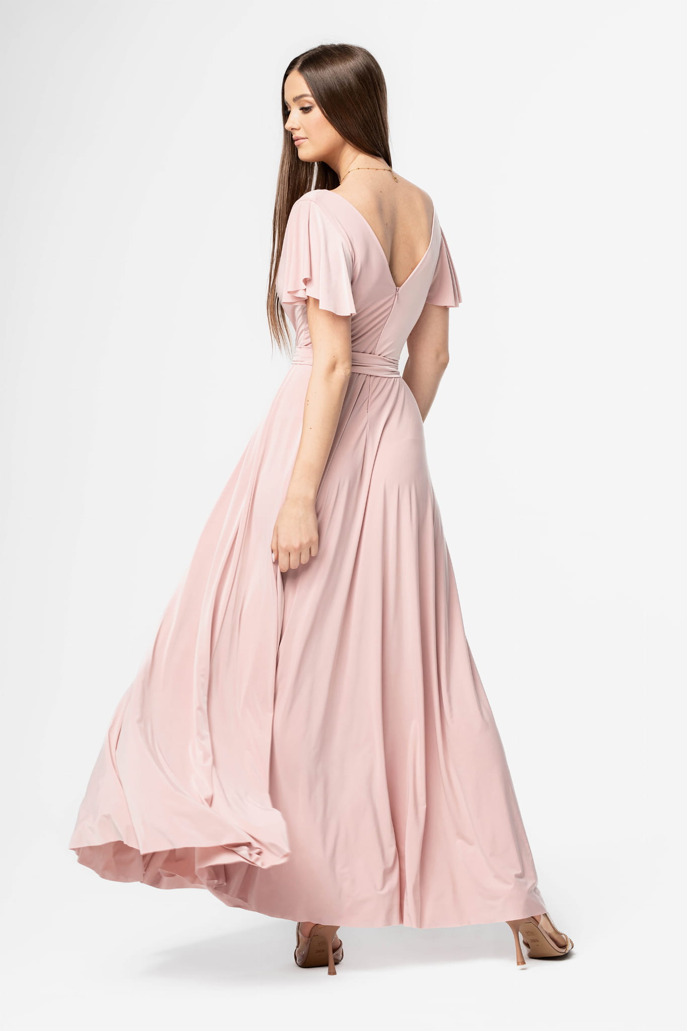 Ramiona zostały okryte motylkowymi rękawami, które perfekcyjnie współgrają z dekoltem w kształcie litery V. Delikatnie rozkloszowany dół sukienki dodaje sylwetce lekkości i wdzięku, natomiast wiązanie w pasie podkreśla wcięcie w talii. Abelia idealnie sprawdzi się na każdym eleganckim przyjęciu.