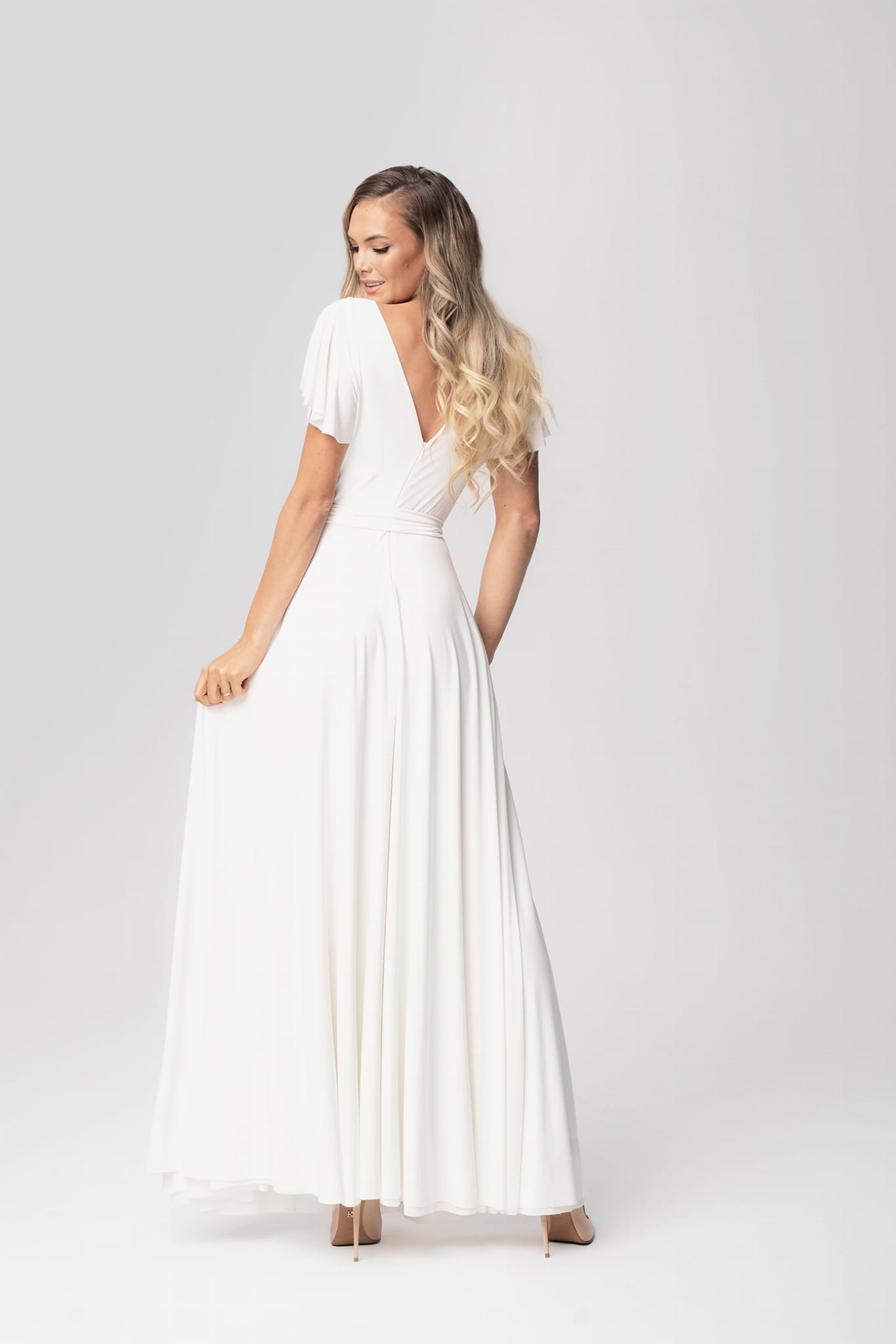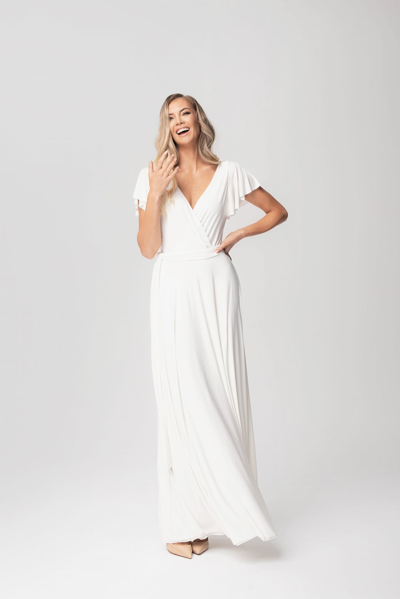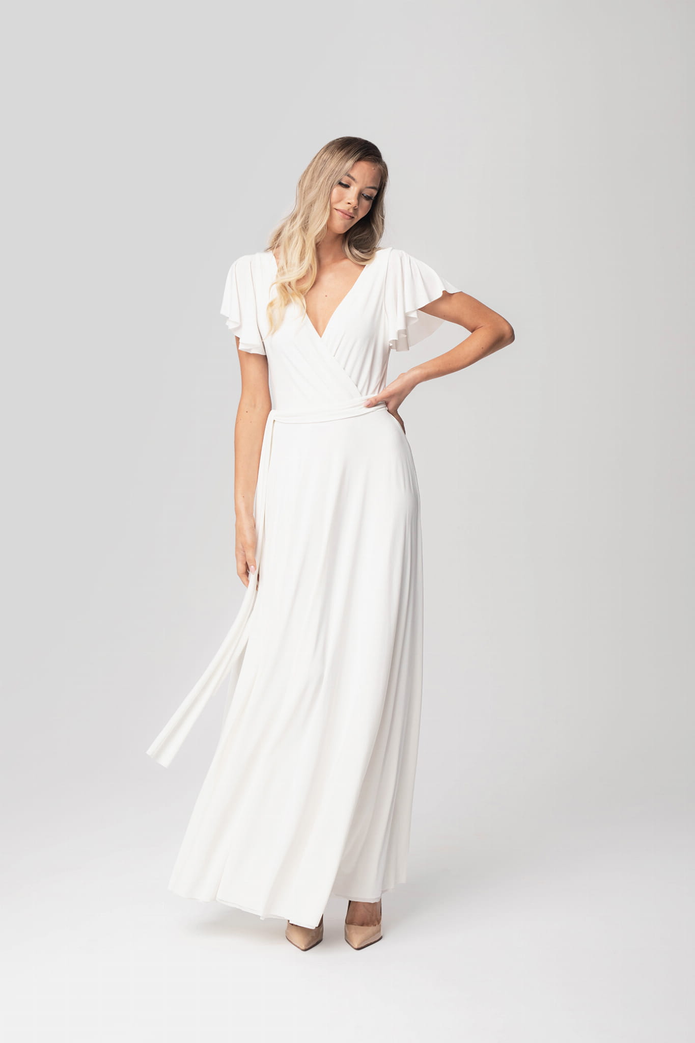 Ramiona zostały okryte motylkowymi rękawami, które perfekcyjnie współgrają z dekoltem w kształcie litery V. Delikatnie rozkloszowany dół sukienki dodaje sylwetce lekkości i wdzięku, natomiast wiązanie w pasie podkreśla wcięcie w talii. Abelia idealnie sprawdzi się na każdym eleganckim przyjęciu.