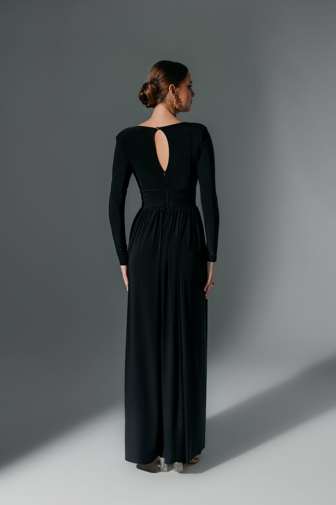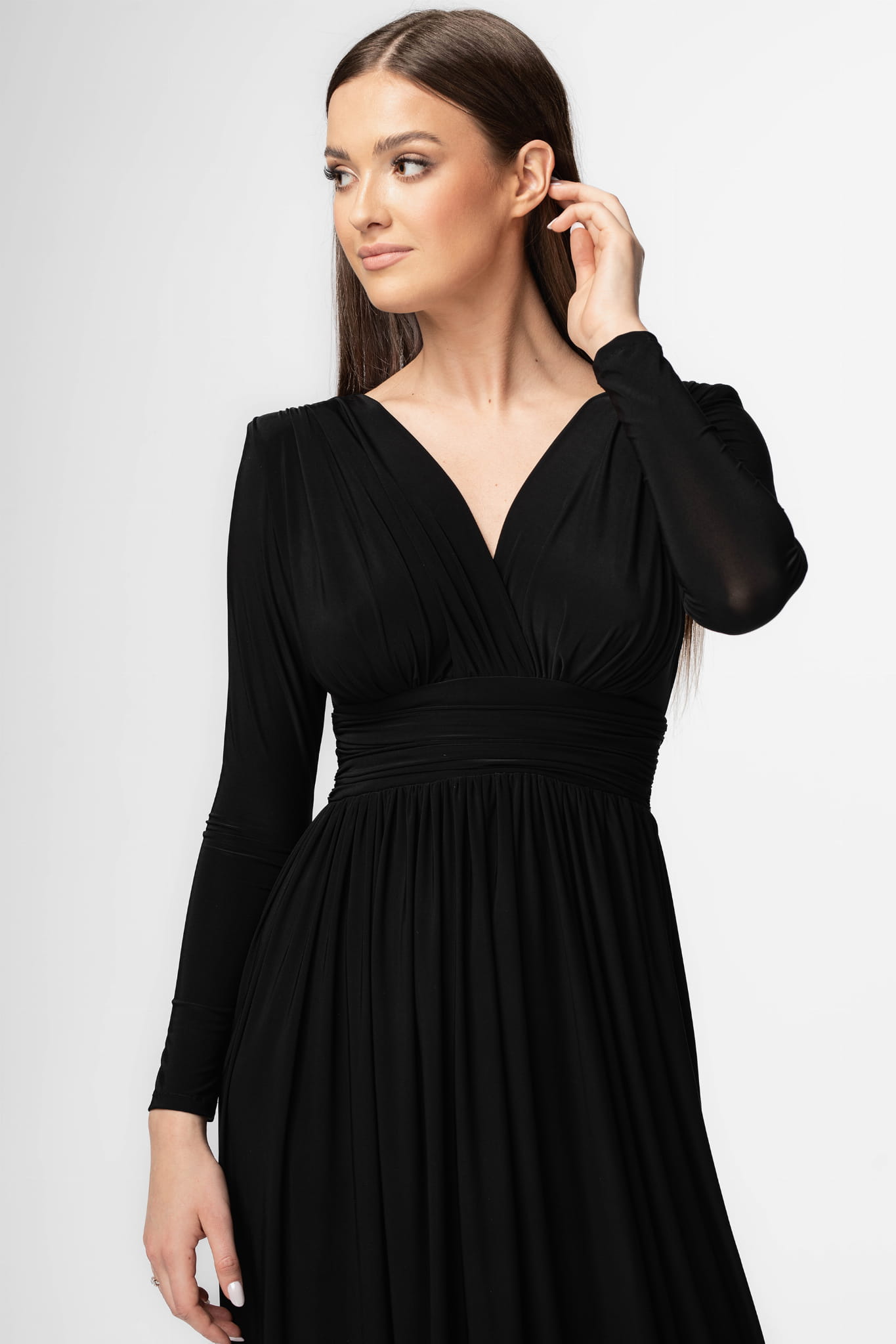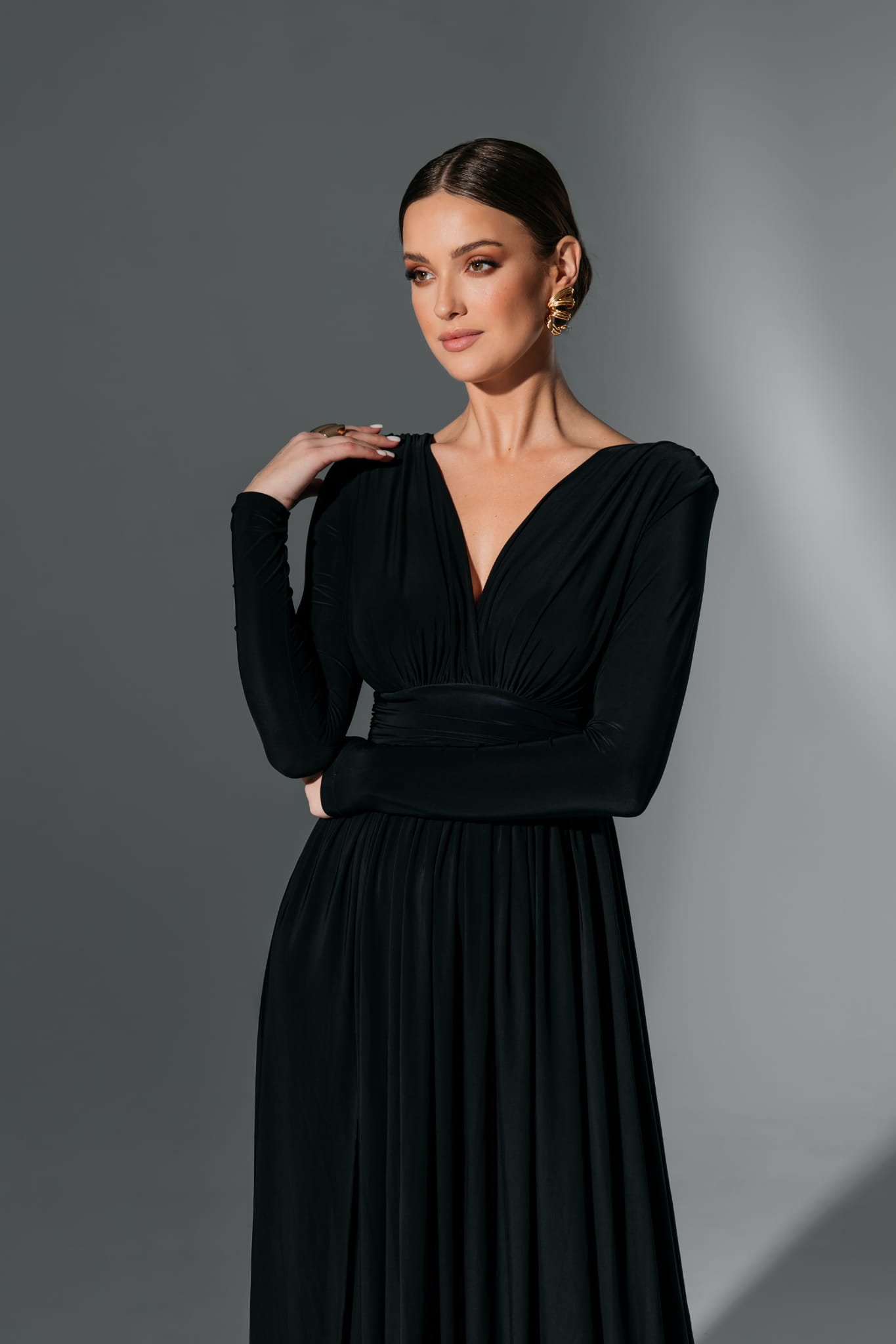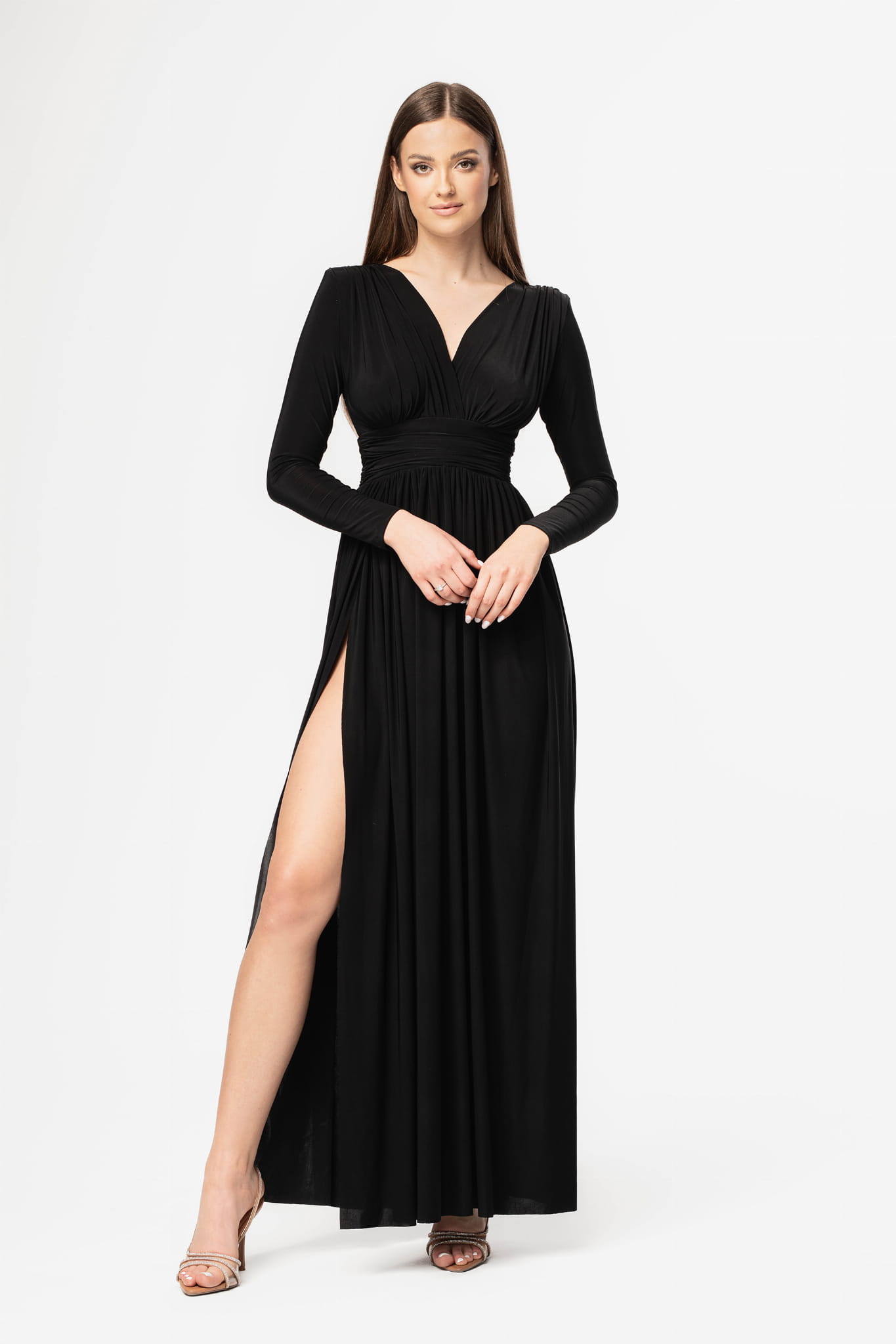 Sukienka o długości maxi, uszyta z przyjemnego w dotyku materiału. Głęboki dekolt i delikatne marszczenia tkaniny przepięknie podkreślają biust. Dodatkowym atutem jest pas, który efektownie zaznacza talię i wysmukla sylwetkę. W ramionach wszyte są poduszeczki, które dodają całości szykowności. Zmysłowe wycięcie odsłania i eksponuje nogę. Długi rękaw. Z tyłu zapinana na kryty zamek.