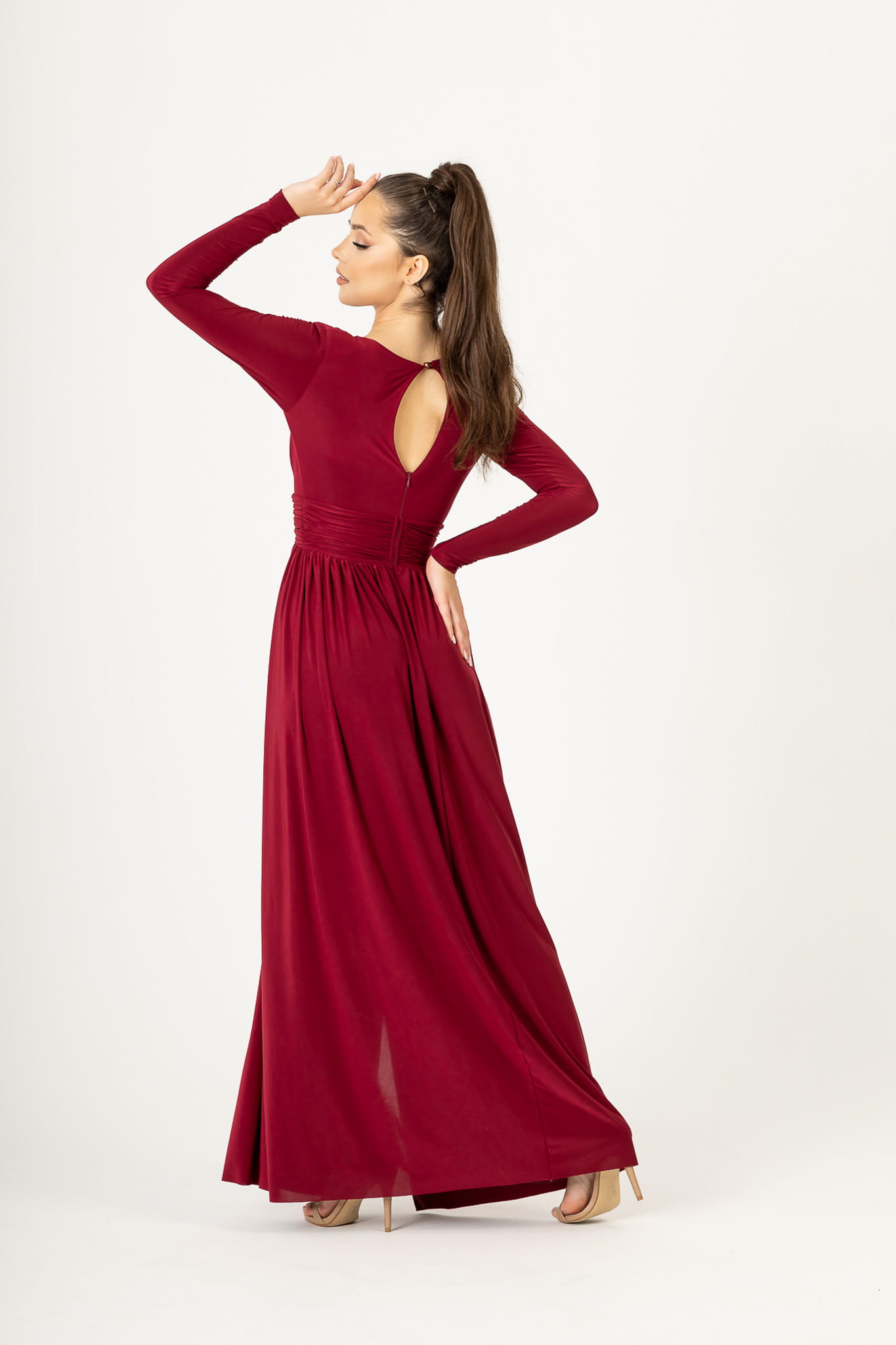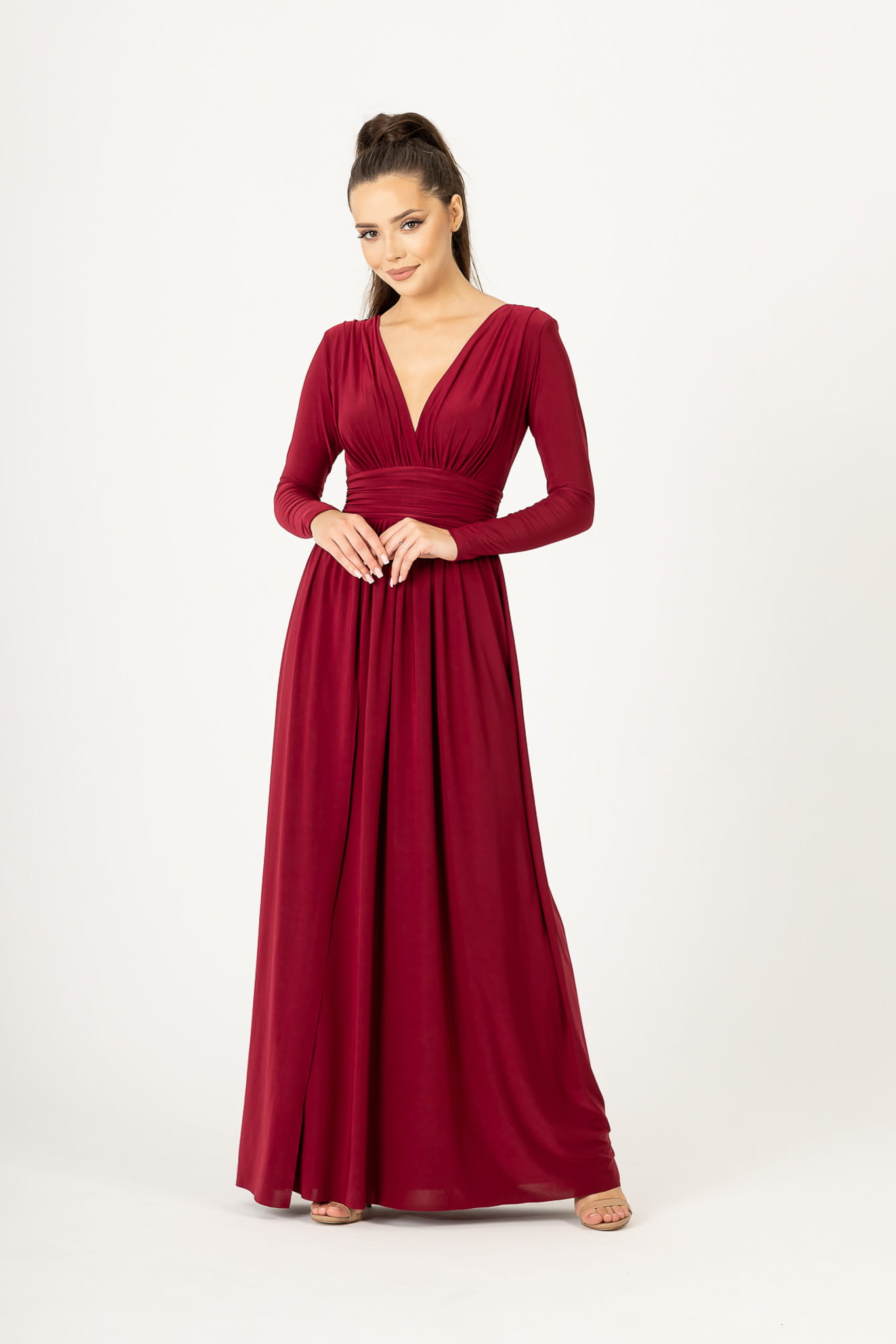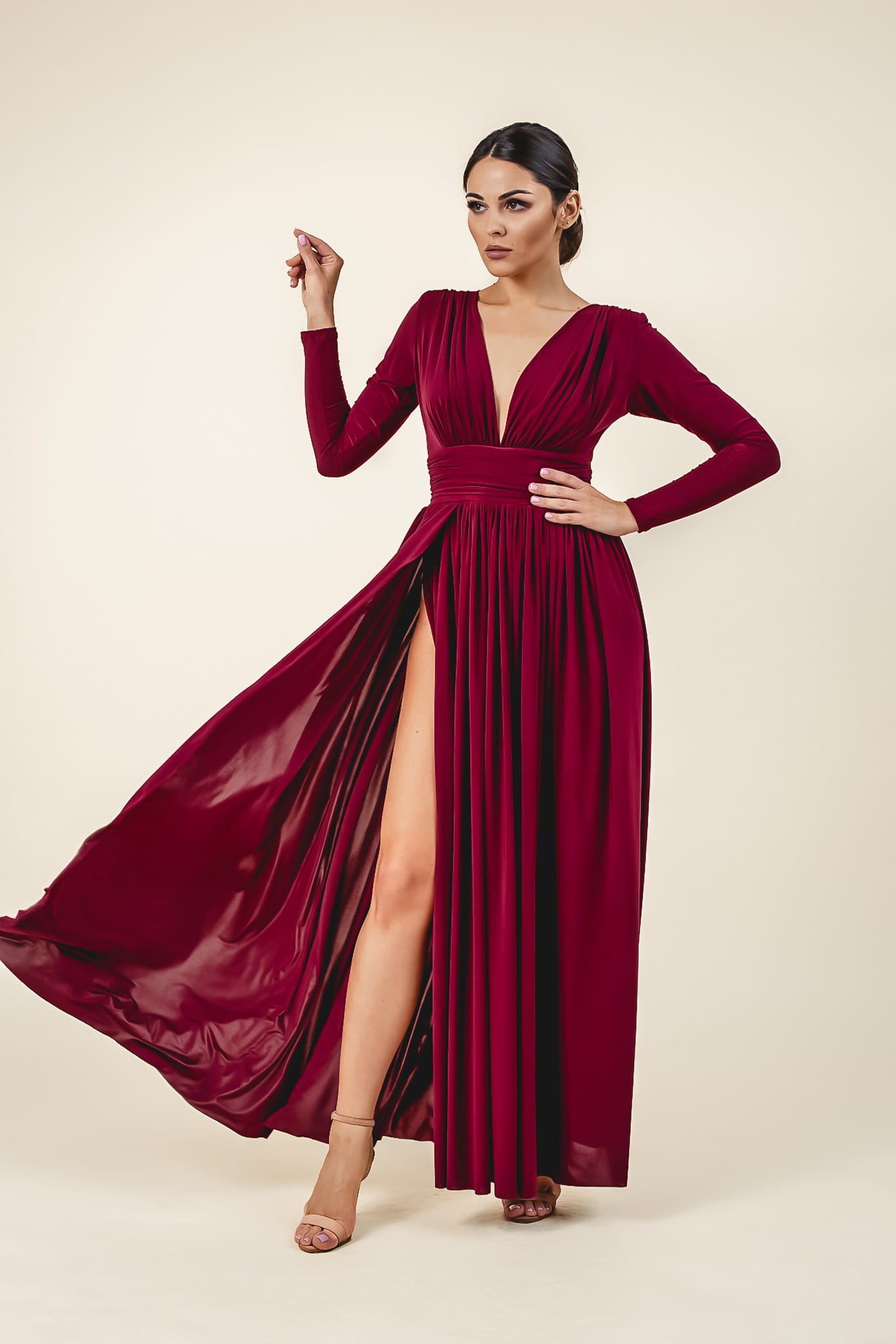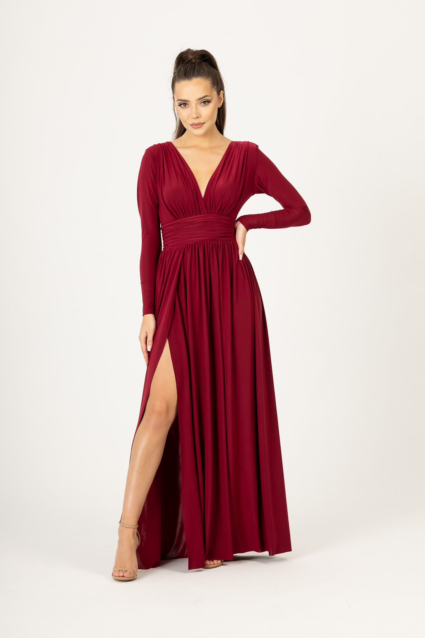 Sukienka o długości maxi, uszyta z przyjemnego w dotyku materiału. Głęboki dekolt i delikatne marszczenia tkaniny przepięknie podkreślają biust. Dodatkowym atutem jest pas, który efektownie zaznacza talię i wysmukla sylwetkę. W ramionach wszyte są poduszeczki, które dodają całości szykowności. Zmysłowe wycięcie odsłania i eksponuje nogę. Długi rękaw. Z tyłu zapinana na kryty zamek.