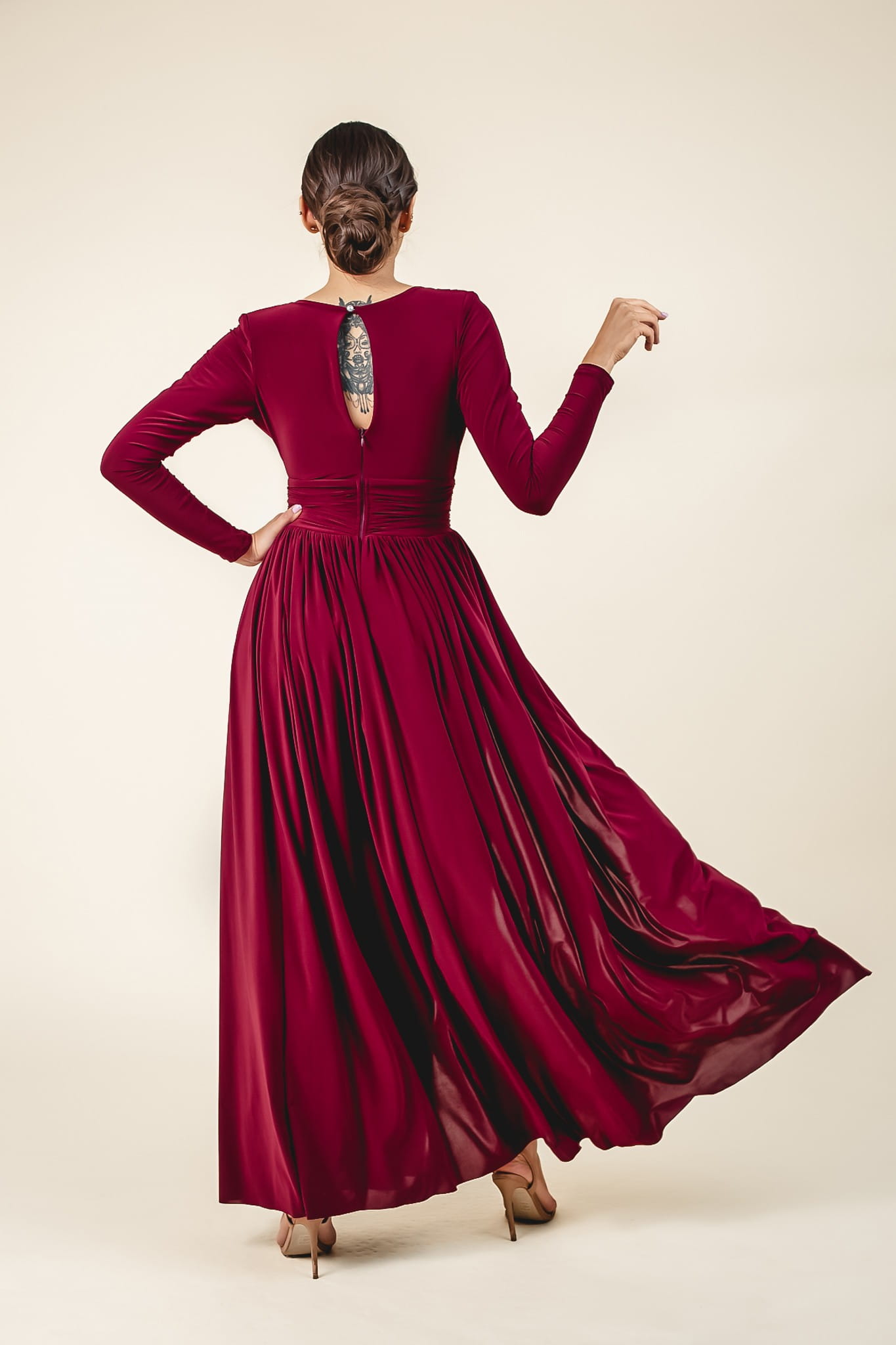 Dół sukienki jest cięty „na ostro” specjalnym nożem elektrycznym i nie jest dodatkowo obszyty. Dzięki temu dzianina wygląda estetycznie i nowocześnie. Prosimy tylko zwrócić uwagę, aby sukienka nie zahaczała o podłogę – zbyt długi dół może prowadzić do uszkodzenia materiału.