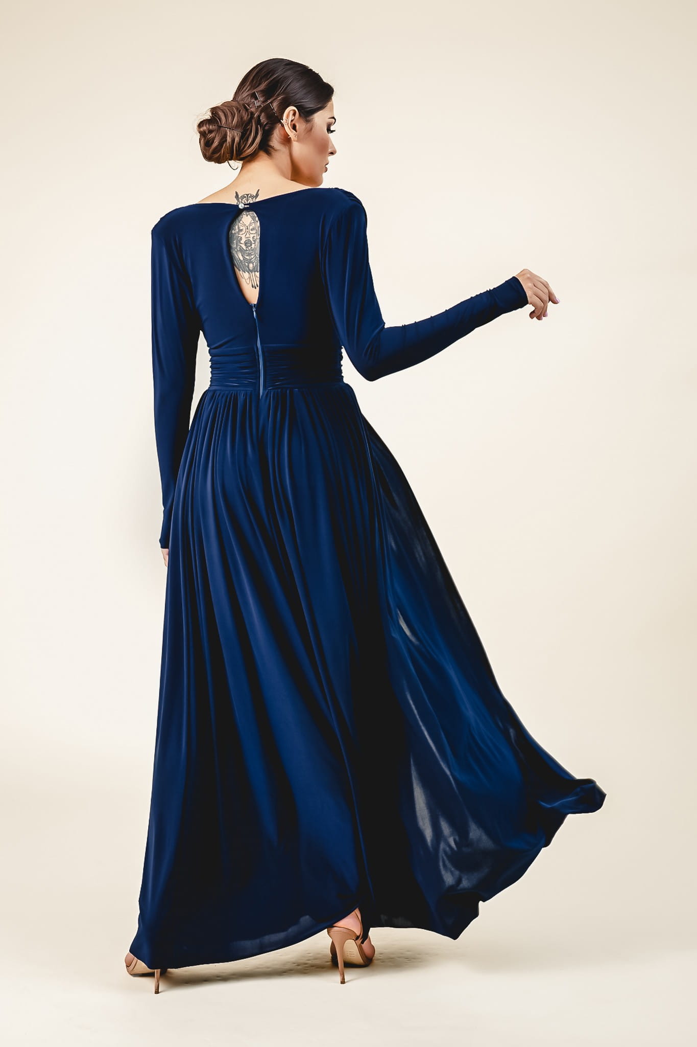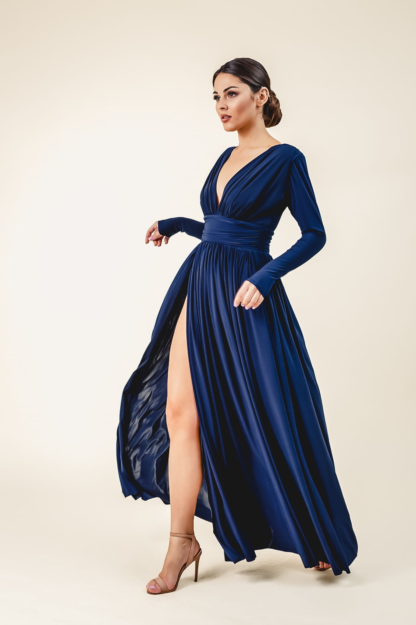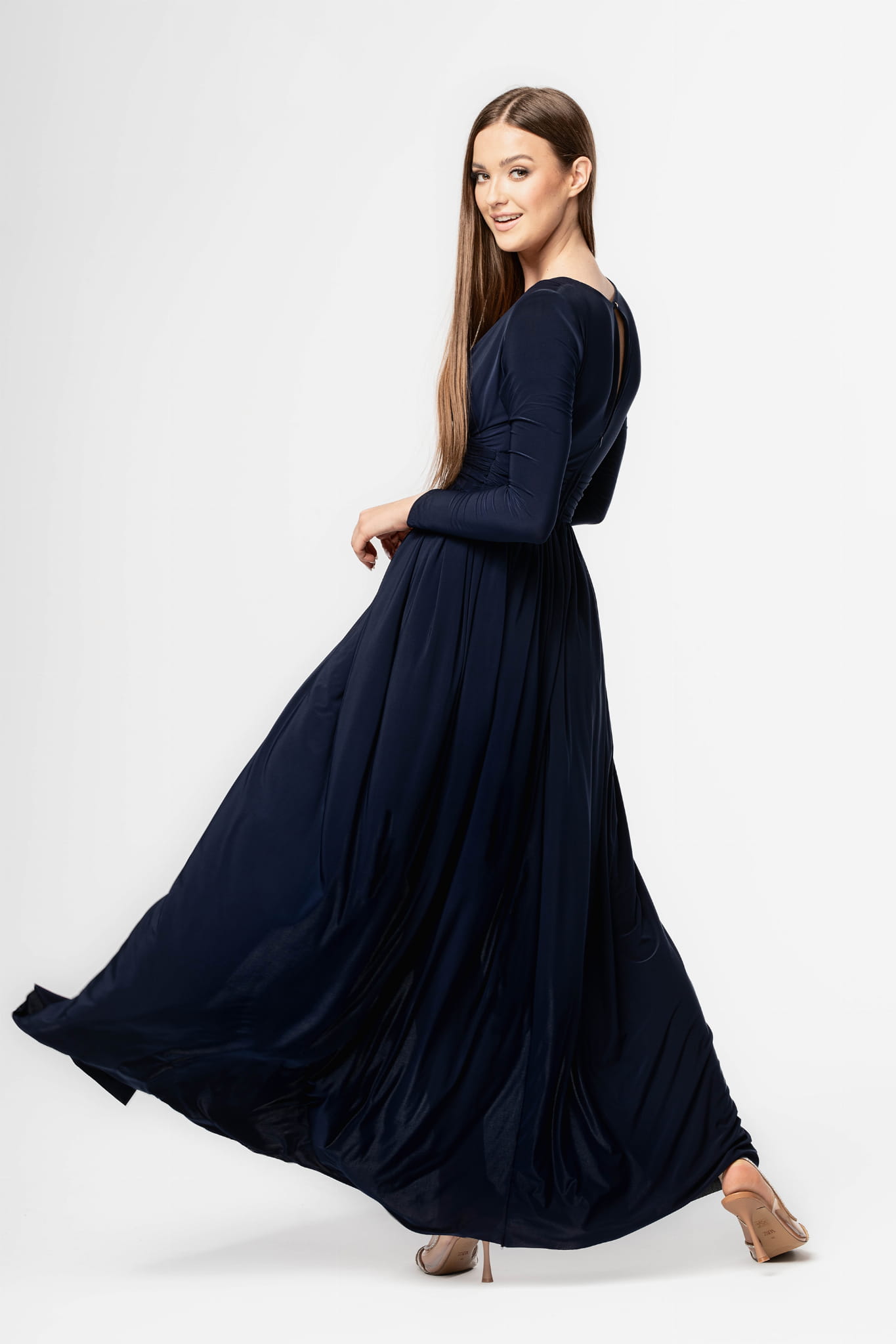 Sukienka o długości maxi, uszyta z przyjemnego w dotyku materiału. Głęboki dekolt i delikatne marszczenia tkaniny przepięknie podkreślają biust. Dodatkowym atutem jest pas, który efektownie zaznacza talię i wysmukla sylwetkę. W ramionach wszyte są poduszeczki, które dodają całości szykowności. Zmysłowe wycięcie odsłania i eksponuje nogę. Długi rękaw. Z tyłu zapinana na kryty zamek.