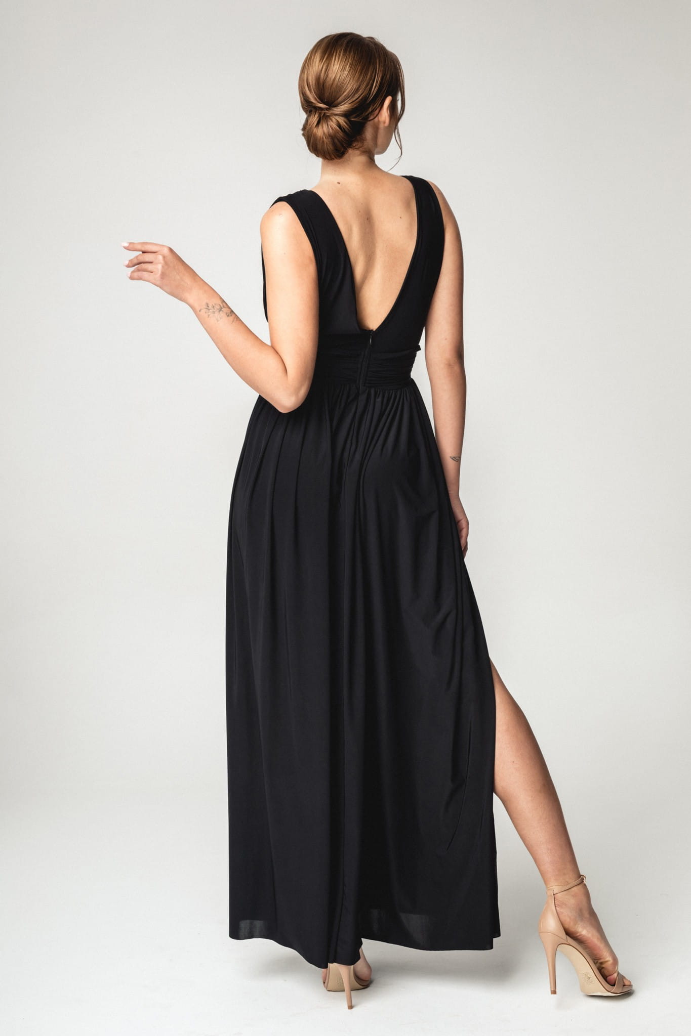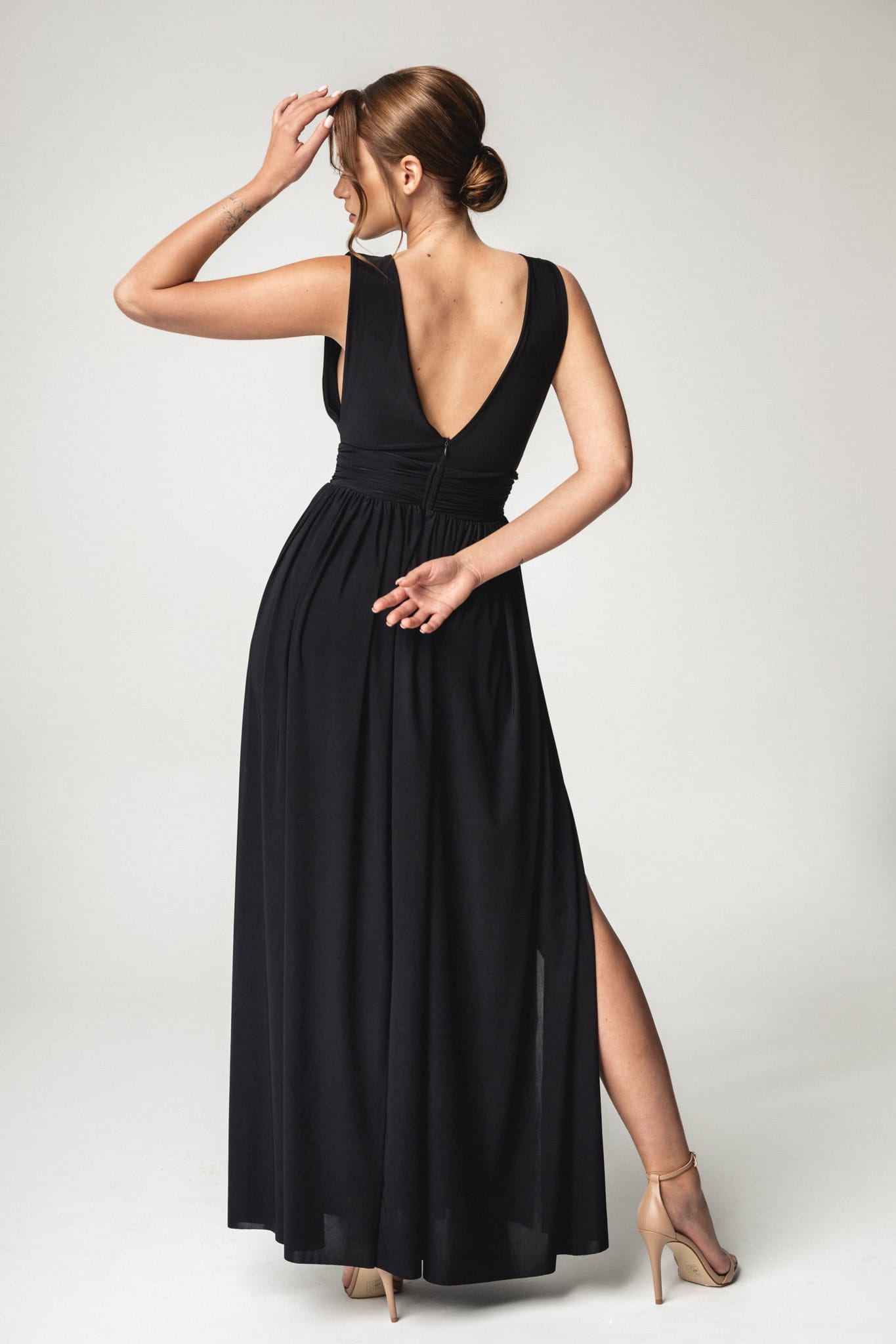 Suknia o długości maxi, uszyta z przyjemnego w dotyku materiału. Głęboki dekolt i delikatne marszczenia tkaniny przepięknie podkreślają biust. Dodatkowym atutem jest pas, który efektownie zaznacza talię i wysmukla sylwetkę. Zmysłowe wycięcie na plecach. Ponętne wycięcie odsłania i eksponuje nogę. Z tyłu zapinana na kryty zamek.
