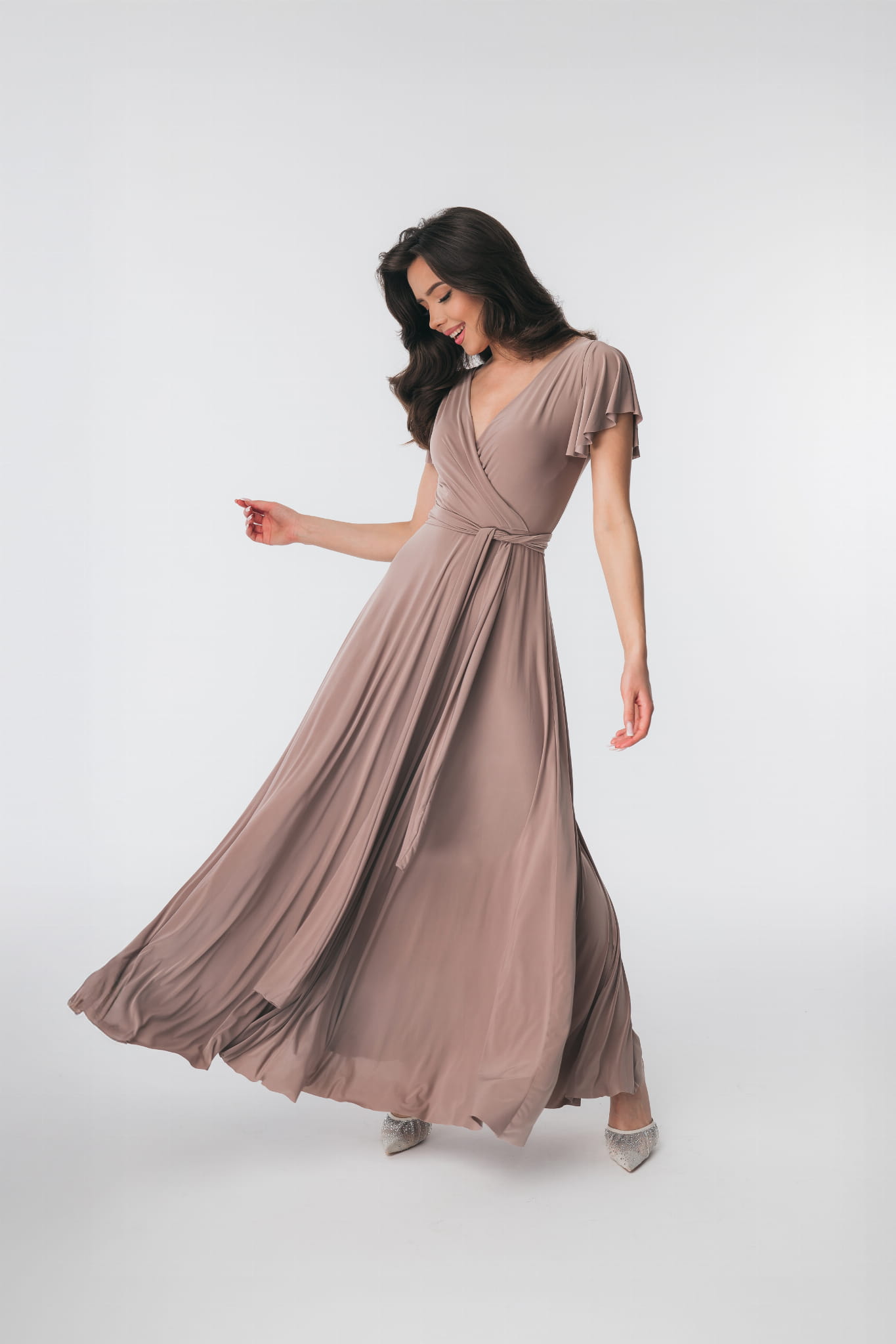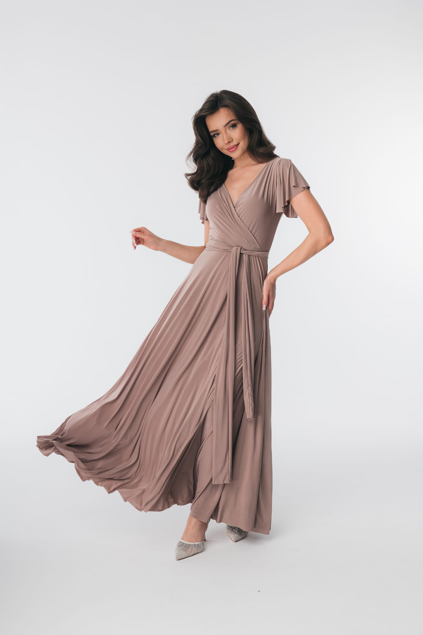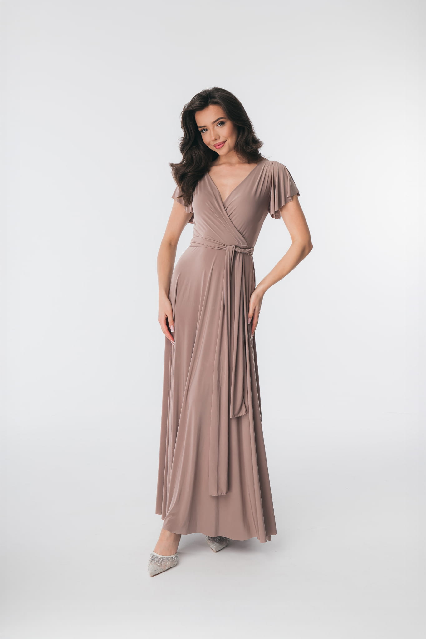 Ramiona zostały okryte motylkowymi rękawami, które perfekcyjnie współgrają z dekoltem w kształcie litery V. Delikatnie rozkloszowany dół sukienki dodaje sylwetce lekkości i wdzięku, natomiast wiązanie w pasie podkreśla wcięcie w talii. Abelia idealnie sprawdzi się na każdym eleganckim przyjęciu.