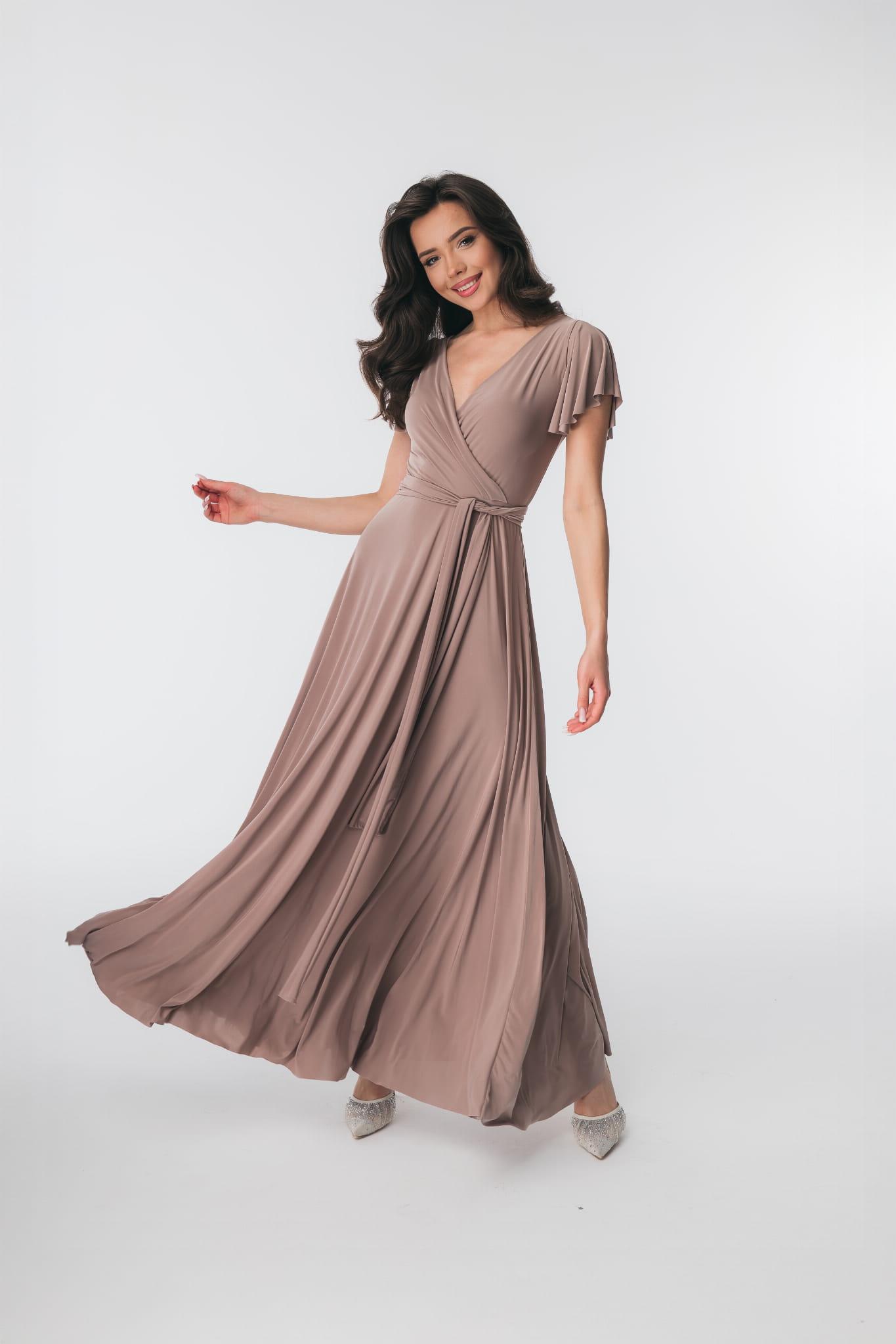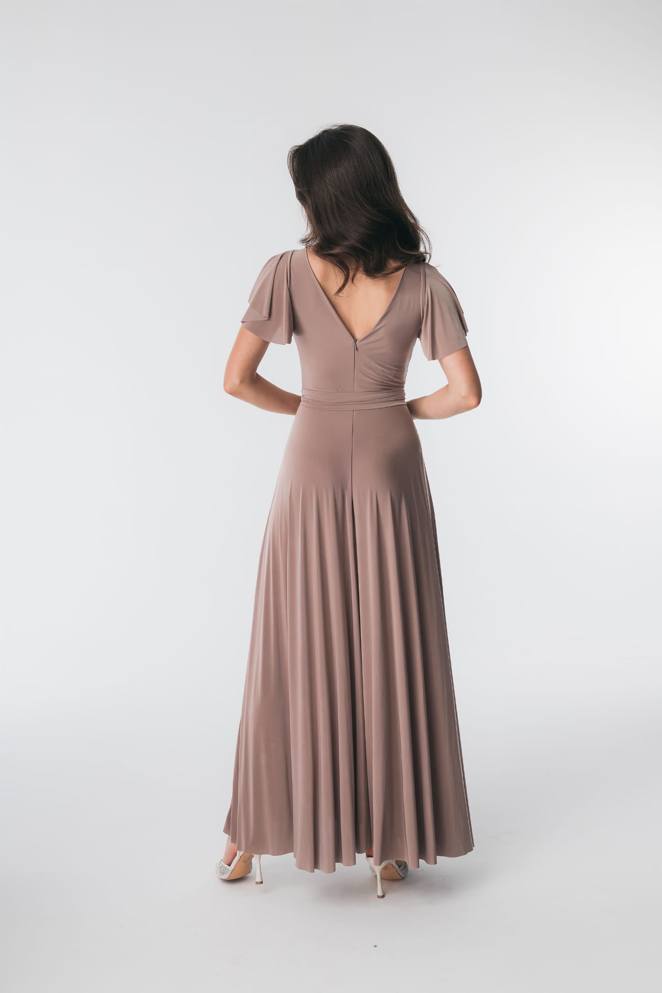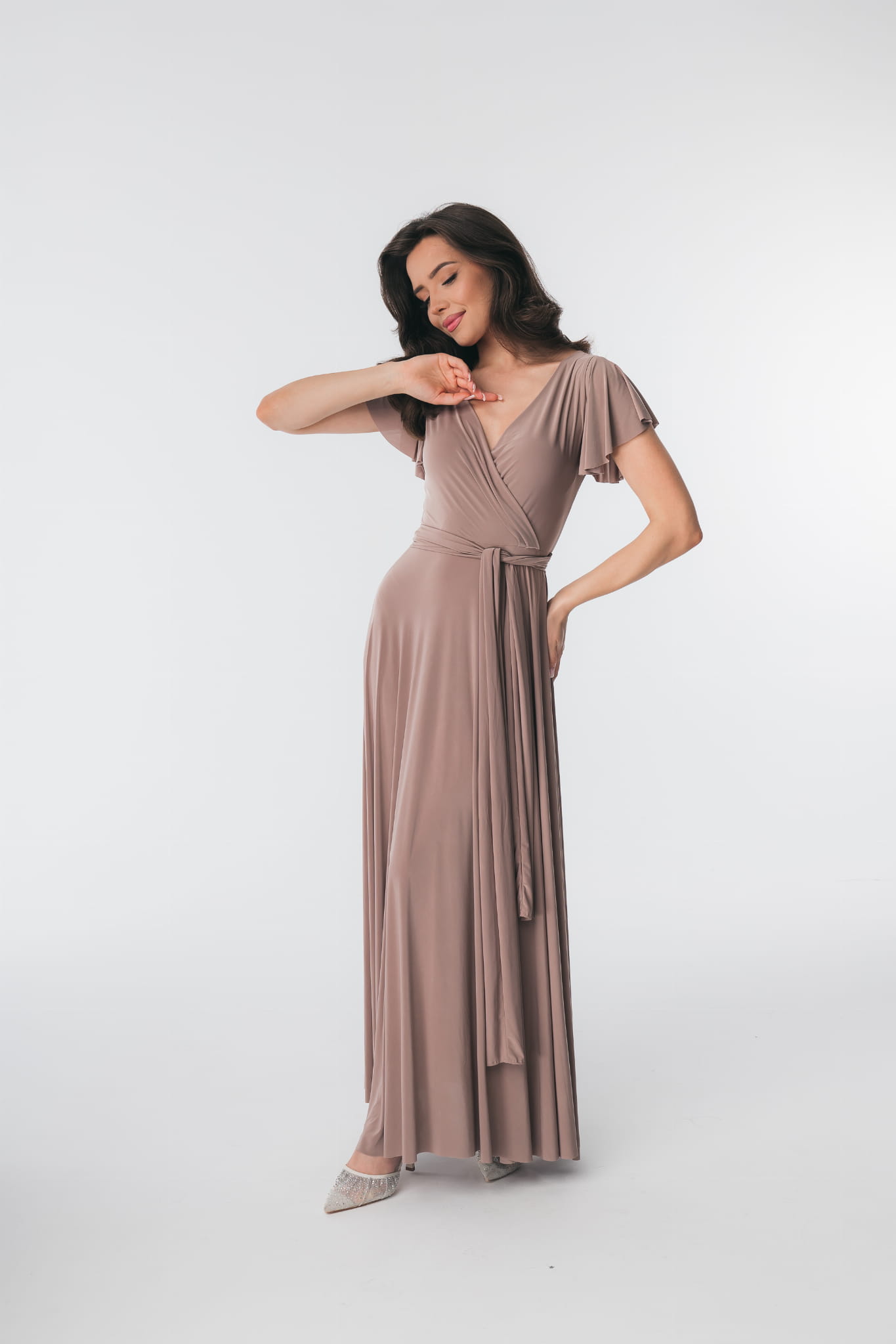 Ramiona zostały okryte motylkowymi rękawami, które perfekcyjnie współgrają z dekoltem w kształcie litery V. Delikatnie rozkloszowany dół sukienki dodaje sylwetce lekkości i wdzięku, natomiast wiązanie w pasie podkreśla wcięcie w talii. Abelia idealnie sprawdzi się na każdym eleganckim przyjęciu.