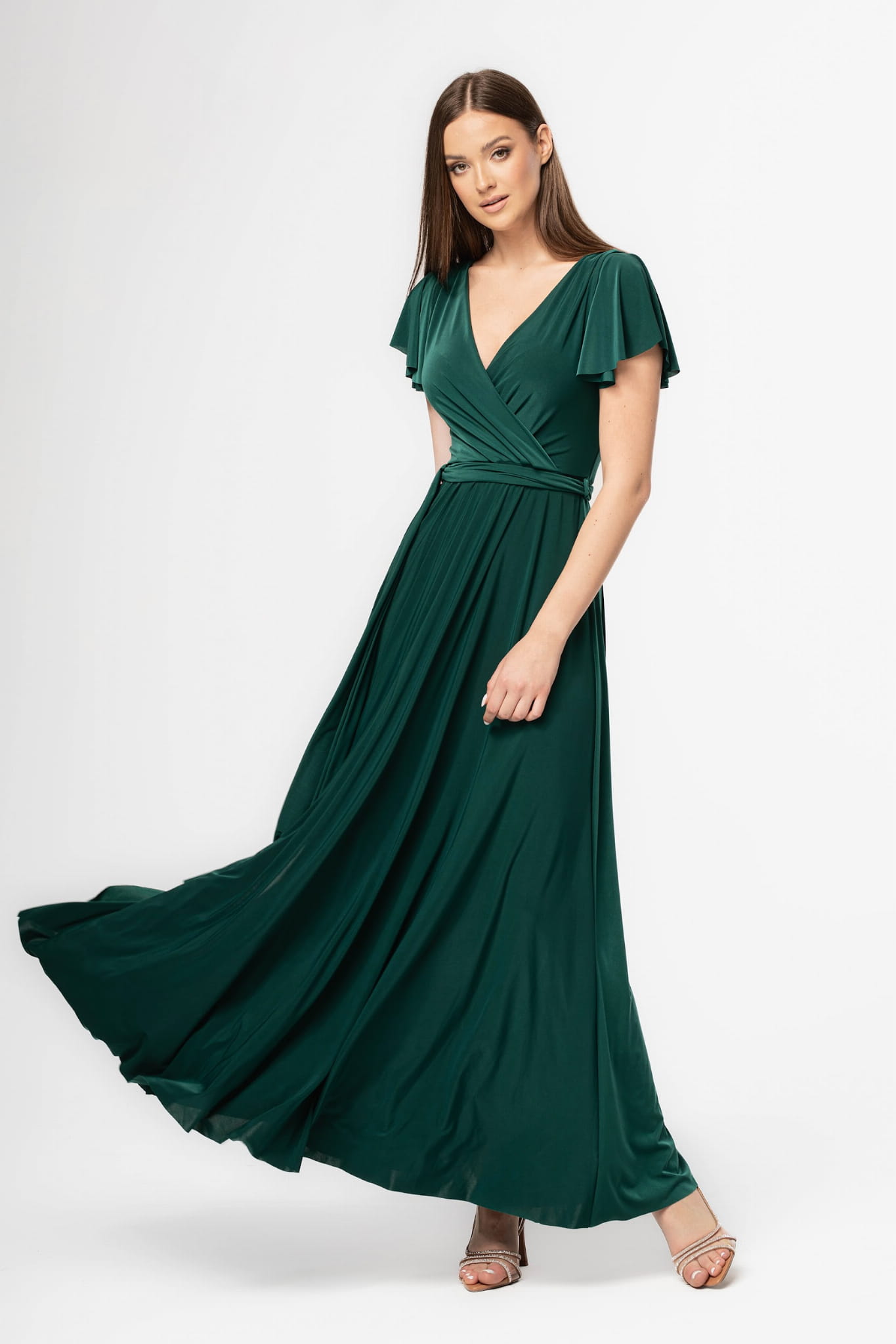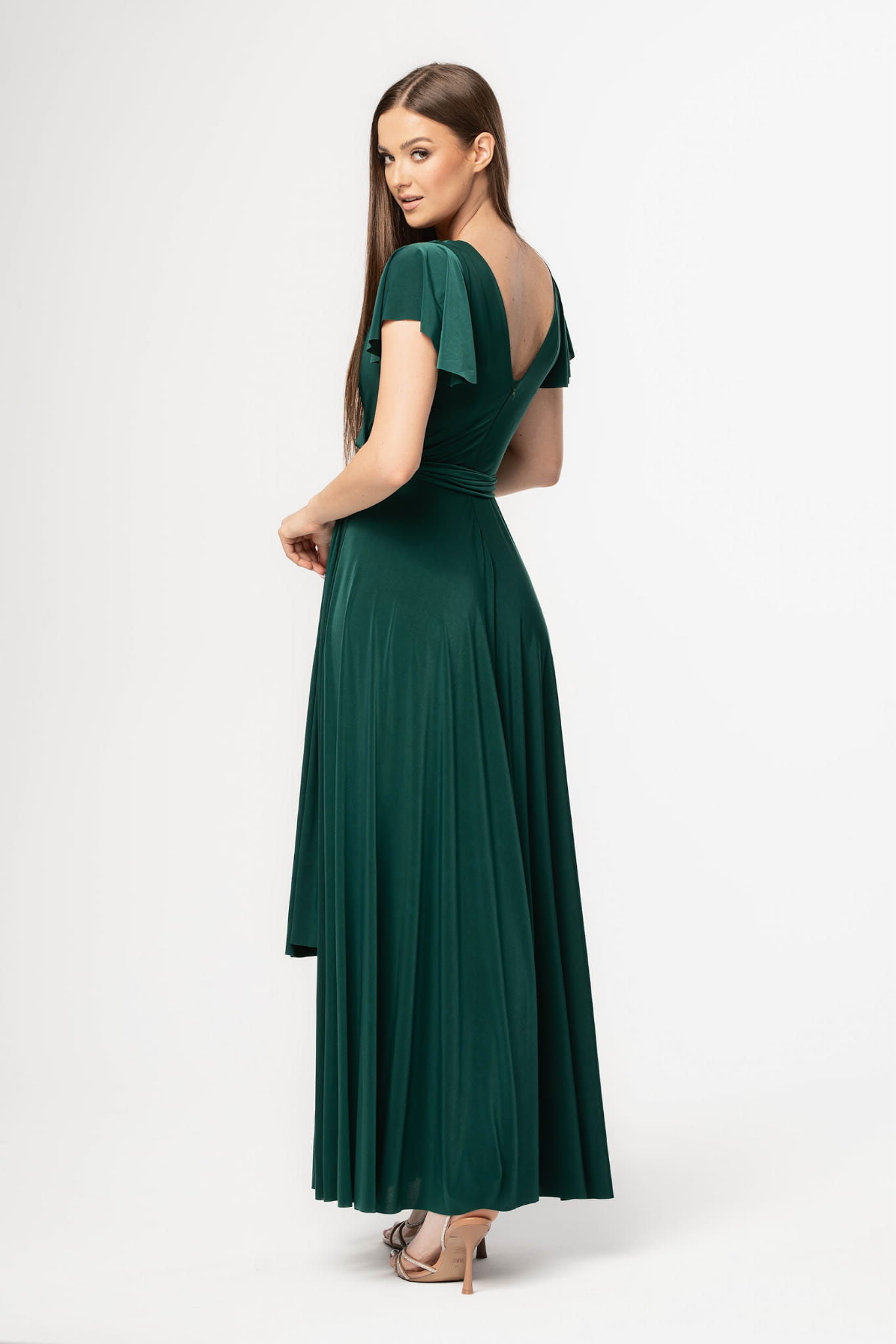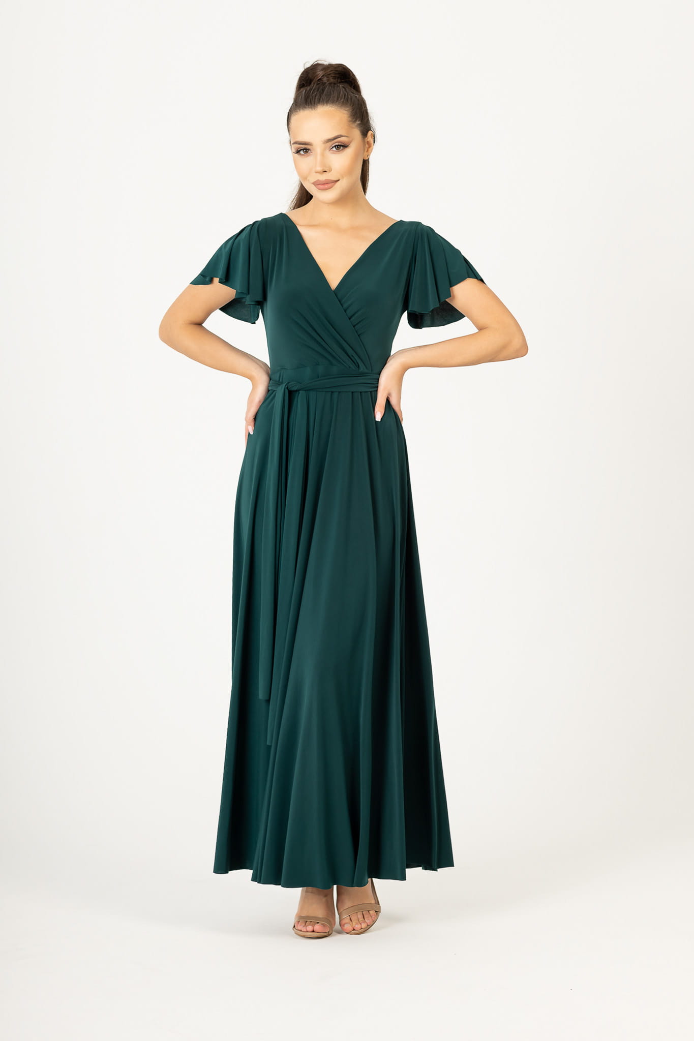 Ramiona zostały okryte motylkowymi rękawami, które perfekcyjnie współgrają z dekoltem w kształcie litery V. Delikatnie rozkloszowany dół sukienki dodaje sylwetce lekkości i wdzięku, natomiast wiązanie w pasie podkreśla wcięcie w talii. Abelia idealnie sprawdzi się na każdym eleganckim przyjęciu.