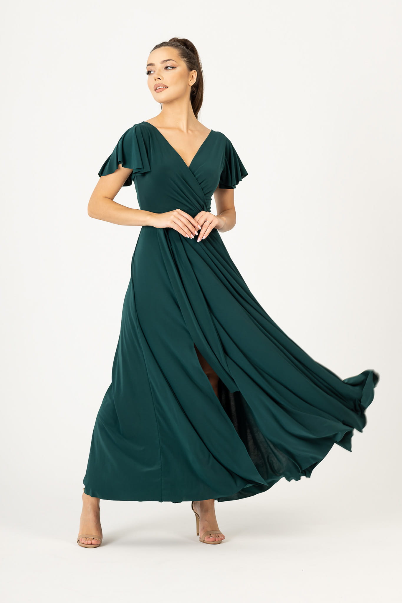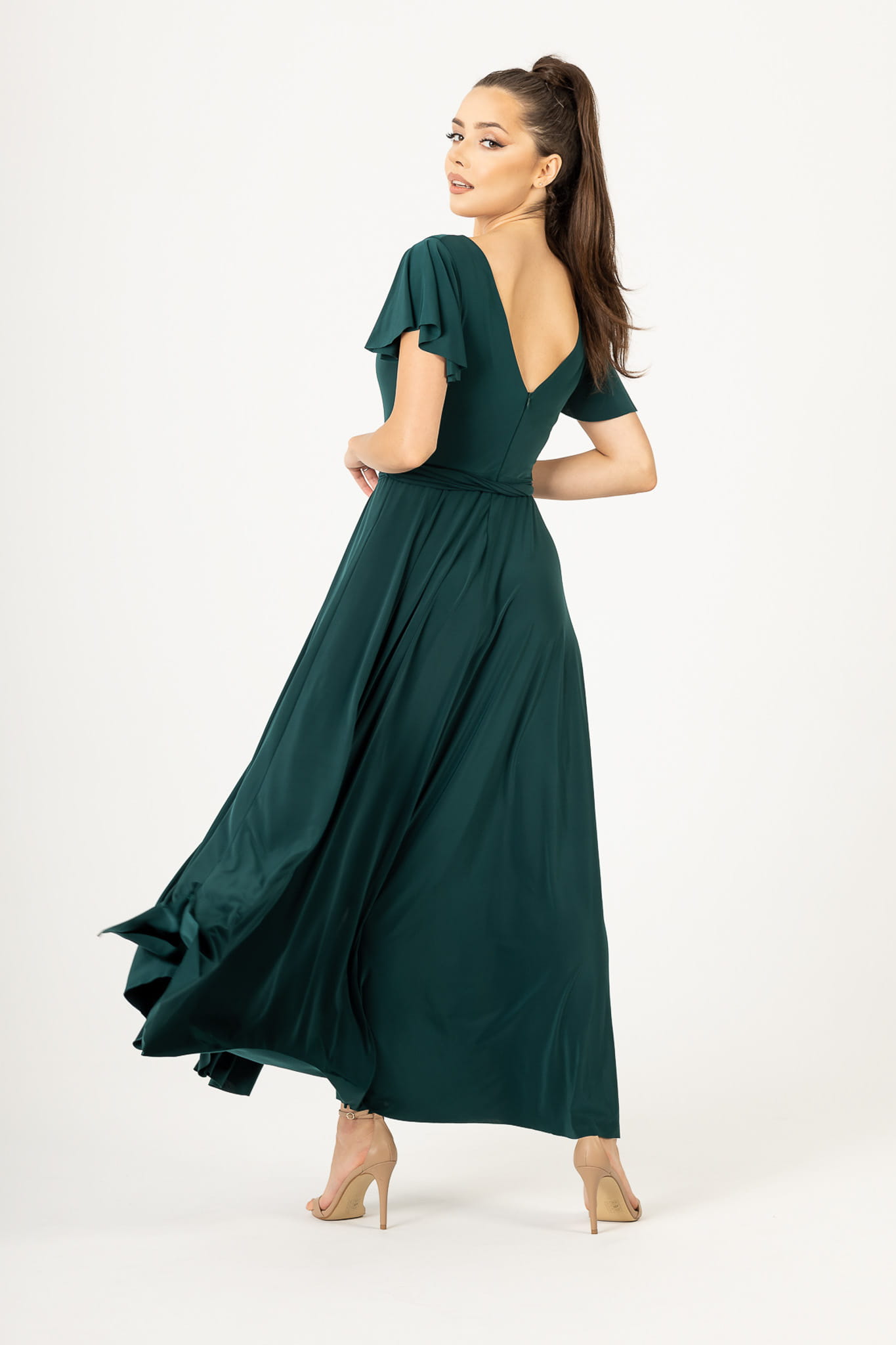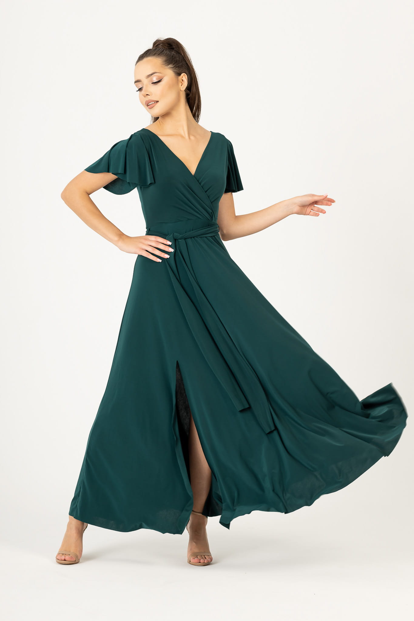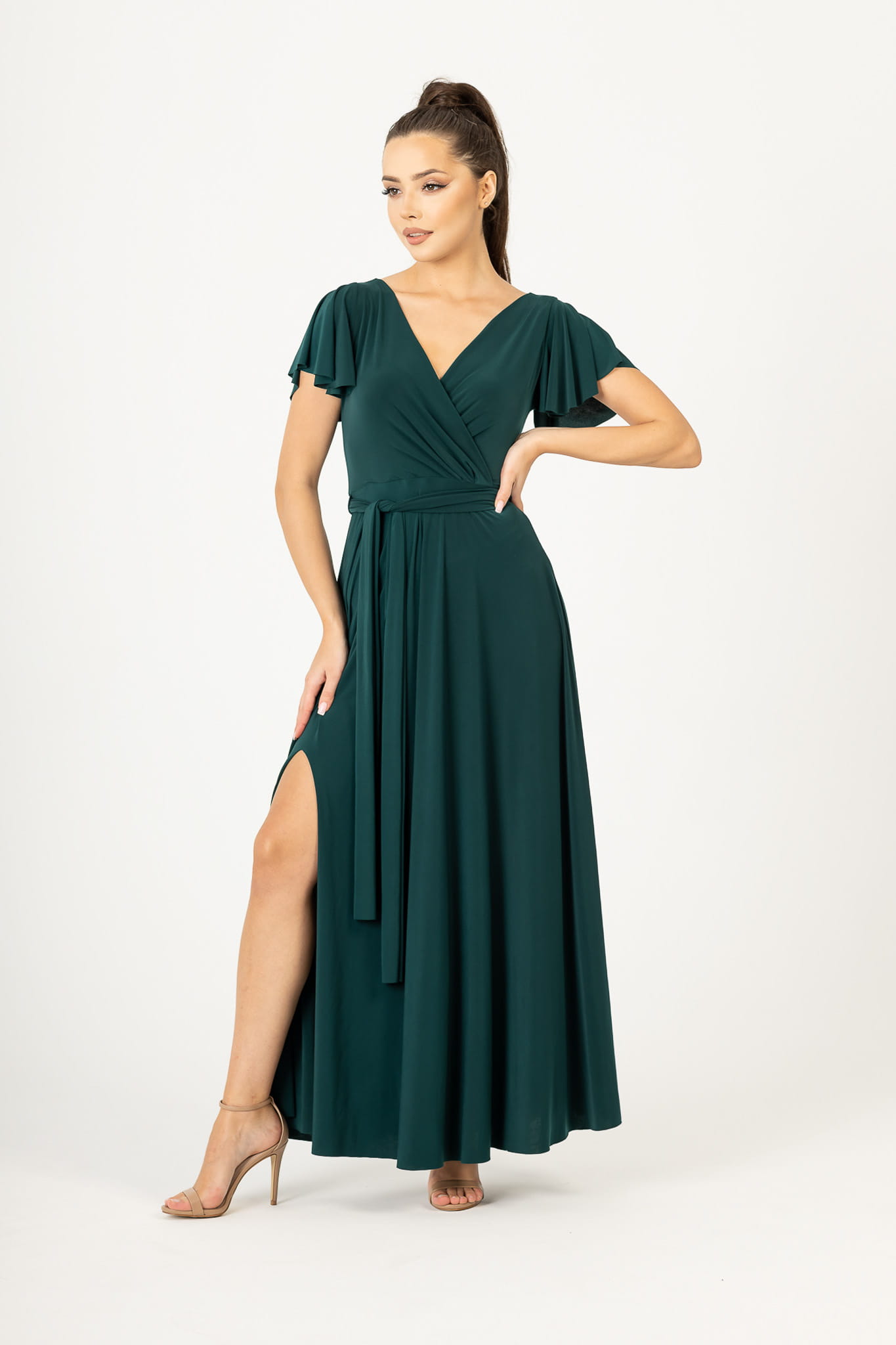 Ramiona zostały okryte motylkowymi rękawami, które perfekcyjnie współgrają z dekoltem w kształcie litery V. Delikatnie rozkloszowany dół sukienki dodaje sylwetce lekkości i wdzięku, natomiast wiązanie w pasie podkreśla wcięcie w talii. Abelia idealnie sprawdzi się na każdym eleganckim przyjęciu.
