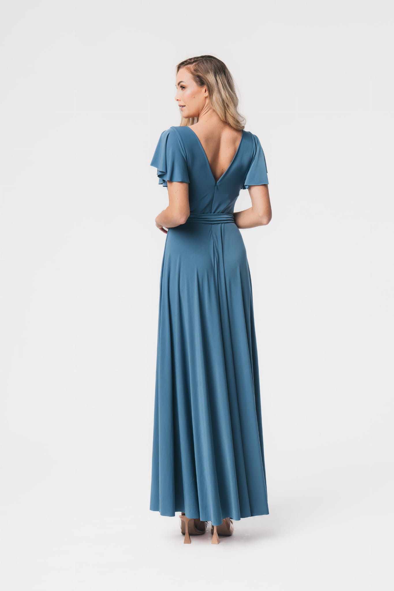 Ramiona zostały okryte motylkowymi rękawami, które perfekcyjnie współgrają z dekoltem w kształcie litery V. Delikatnie rozkloszowany dół sukienki dodaje sylwetce lekkości i wdzięku, natomiast wiązanie w pasie podkreśla wcięcie w talii. Abelia idealnie sprawdzi się na każdym eleganckim przyjęciu.