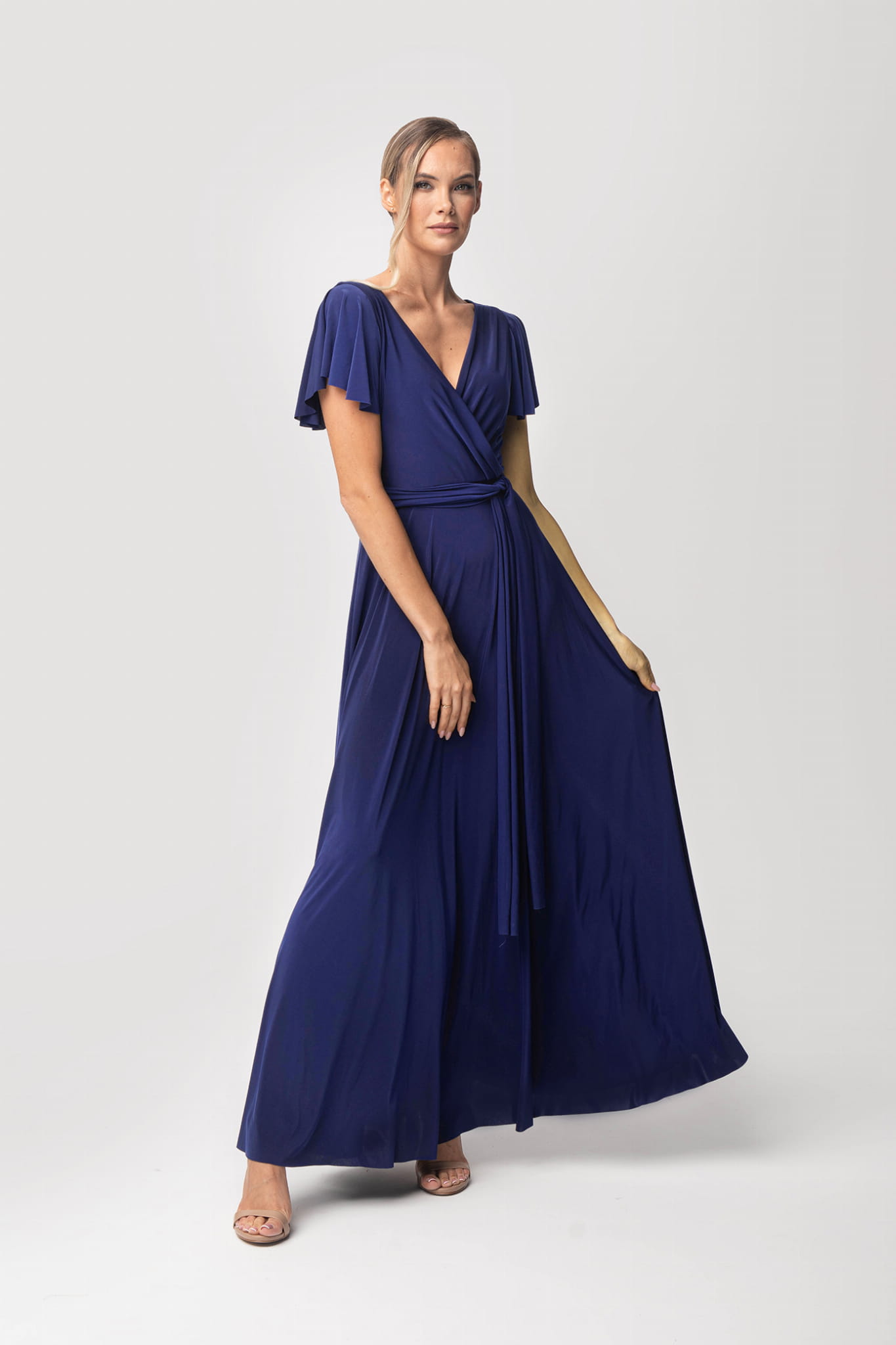 Ramiona zostały okryte motylkowymi rękawami, które perfekcyjnie współgrają z dekoltem w kształcie litery V. Delikatnie rozkloszowany dół sukienki dodaje sylwetce lekkości i wdzięku, natomiast wiązanie w pasie podkreśla wcięcie w talii. Abelia idealnie sprawdzi się na każdym eleganckim przyjęciu.