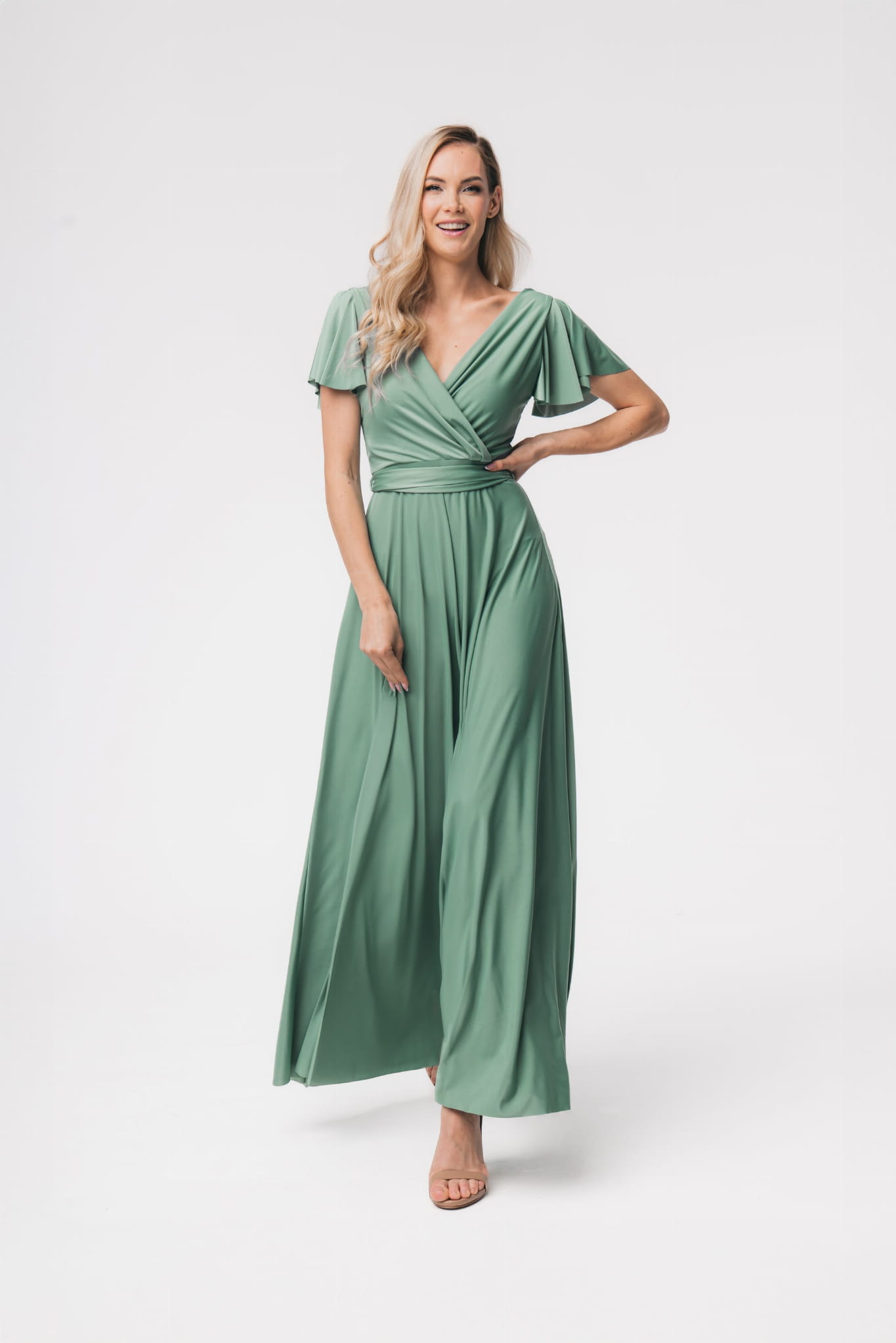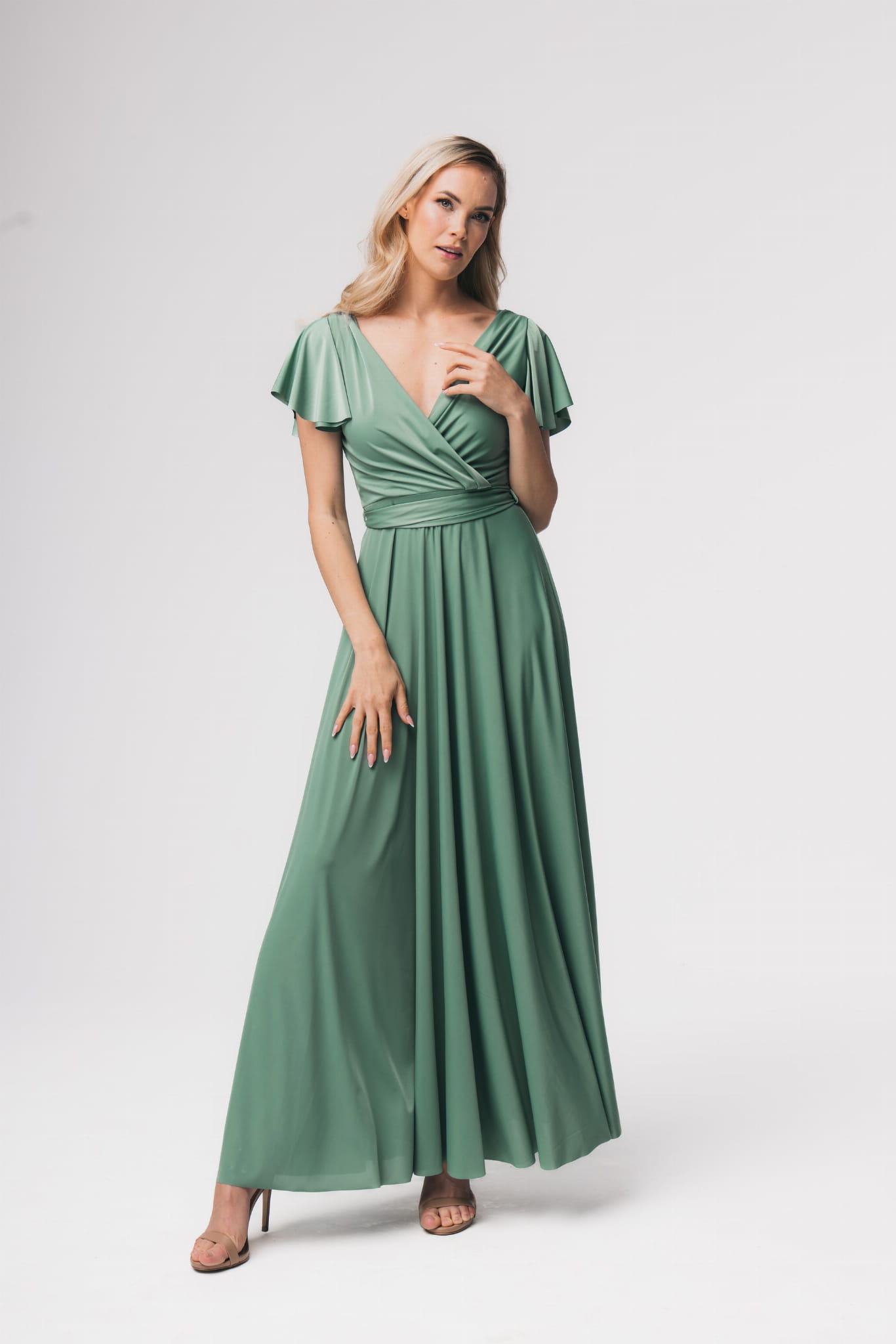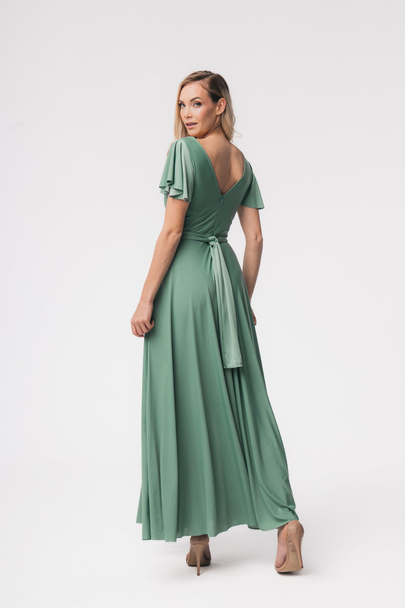 Ramiona zostały okryte motylkowymi rękawami, które perfekcyjnie współgrają z dekoltem w kształcie litery V. Delikatnie rozkloszowany dół sukienki dodaje sylwetce lekkości i wdzięku, natomiast wiązanie w pasie podkreśla wcięcie w talii. Abelia idealnie sprawdzi się na każdym eleganckim przyjęciu.