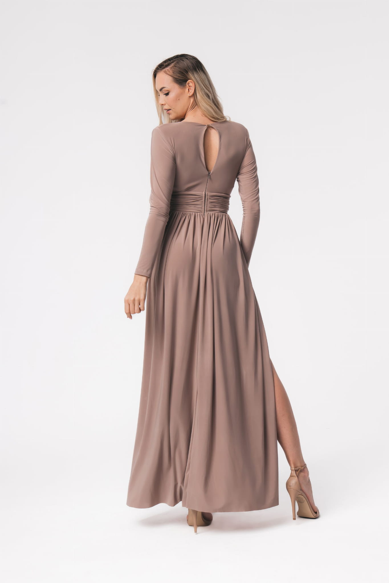 Sukienka o długości maxi, uszyta z przyjemnego w dotyku materiału. Głęboki dekolt i delikatne marszczenia tkaniny przepięknie podkreślają biust. Dodatkowym atutem jest pas, który efektownie zaznacza talię i wysmukla sylwetkę. W ramionach wszyte są poduszeczki, które dodają całości szykowności. Zmysłowe wycięcie odsłania i eksponuje nogę. Długi rękaw. Z tyłu zapinana na kryty zamek.