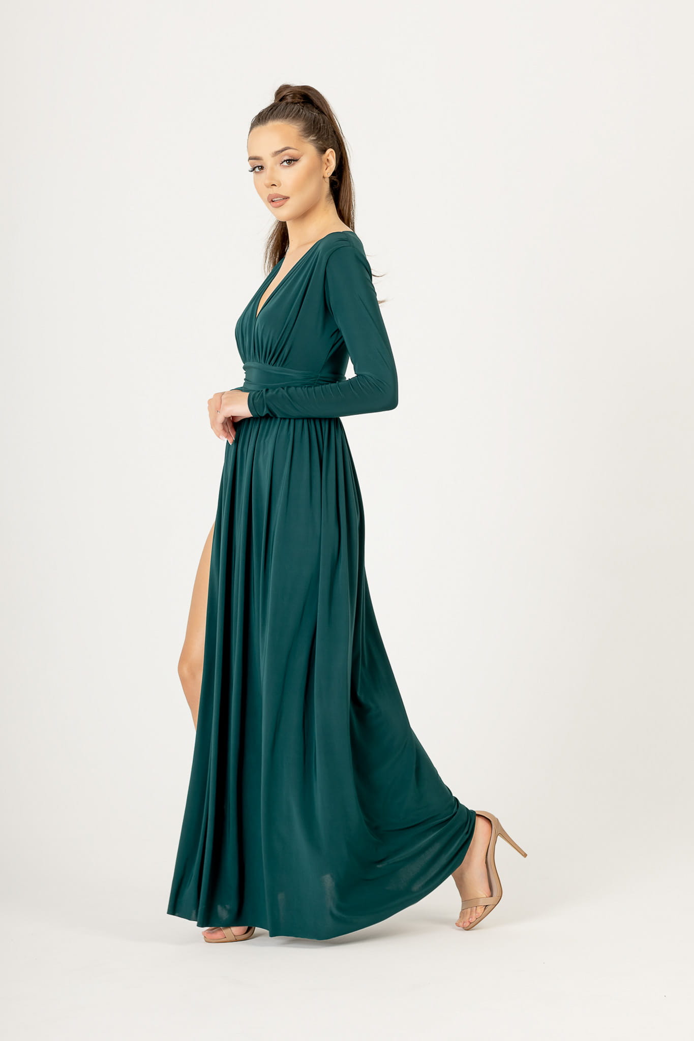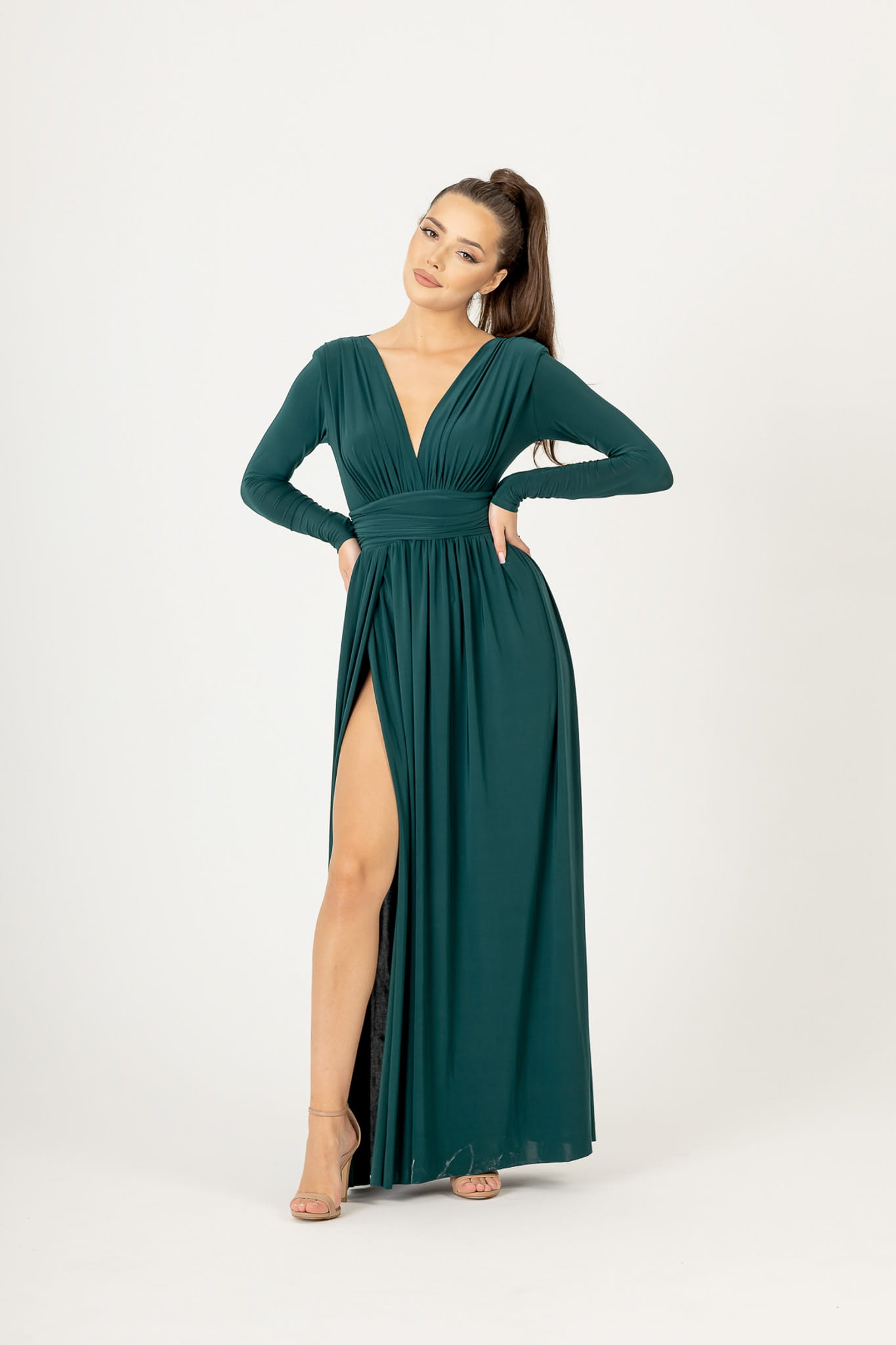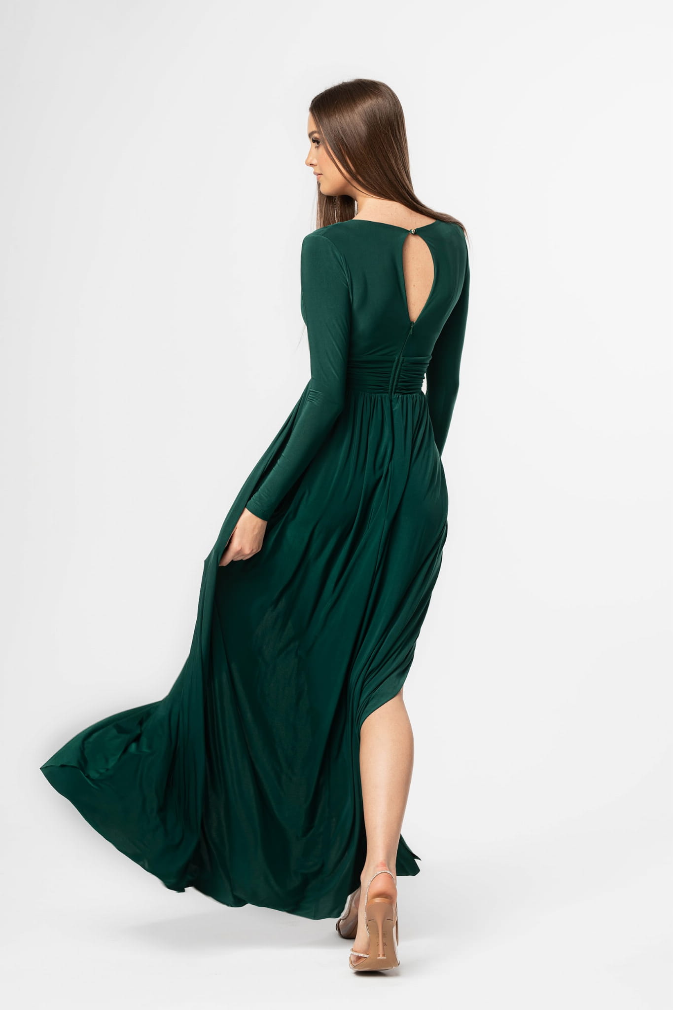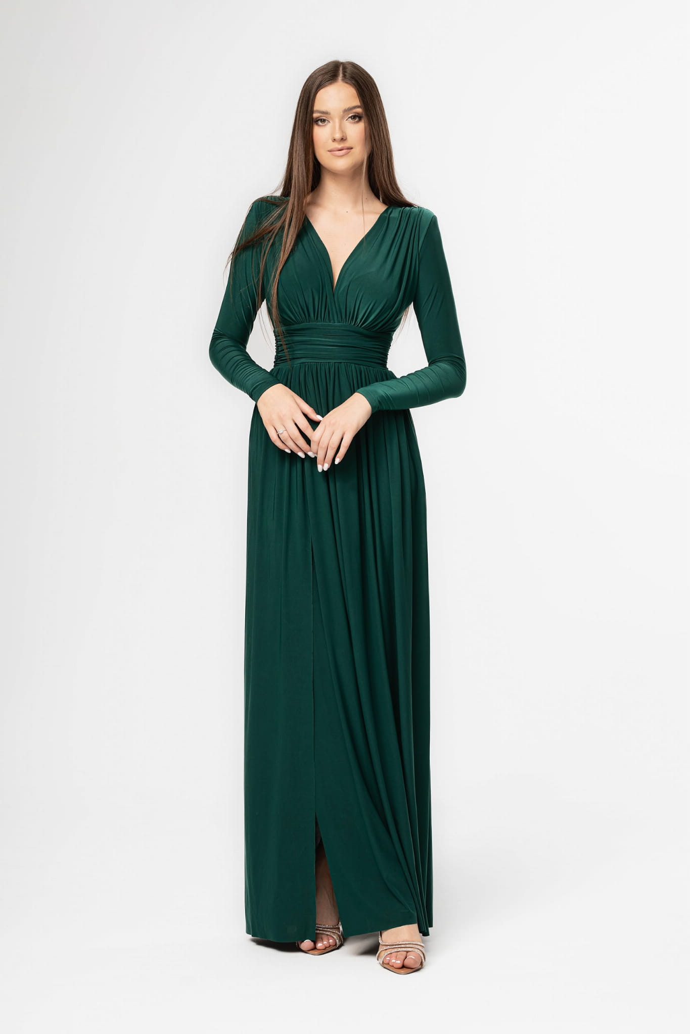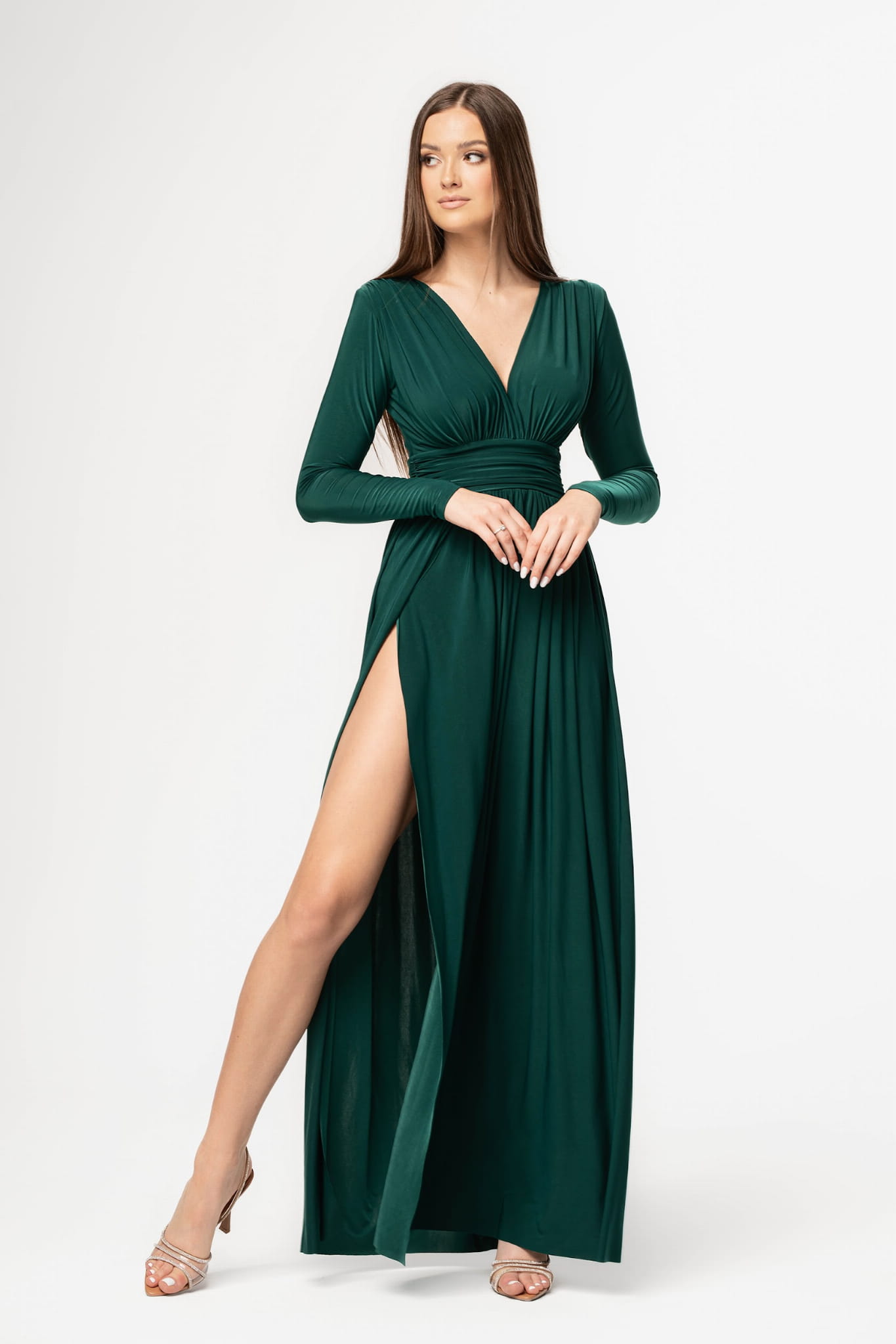 Sukienka o długości maxi, uszyta z przyjemnego w dotyku materiału. Głęboki dekolt i delikatne marszczenia tkaniny przepięknie podkreślają biust. Dodatkowym atutem jest pas, który efektownie zaznacza talię i wysmukla sylwetkę. W ramionach wszyte są poduszeczki, które dodają całości szykowności. Zmysłowe wycięcie odsłania i eksponuje nogę. Długi rękaw. Z tyłu zapinana na kryty zamek.