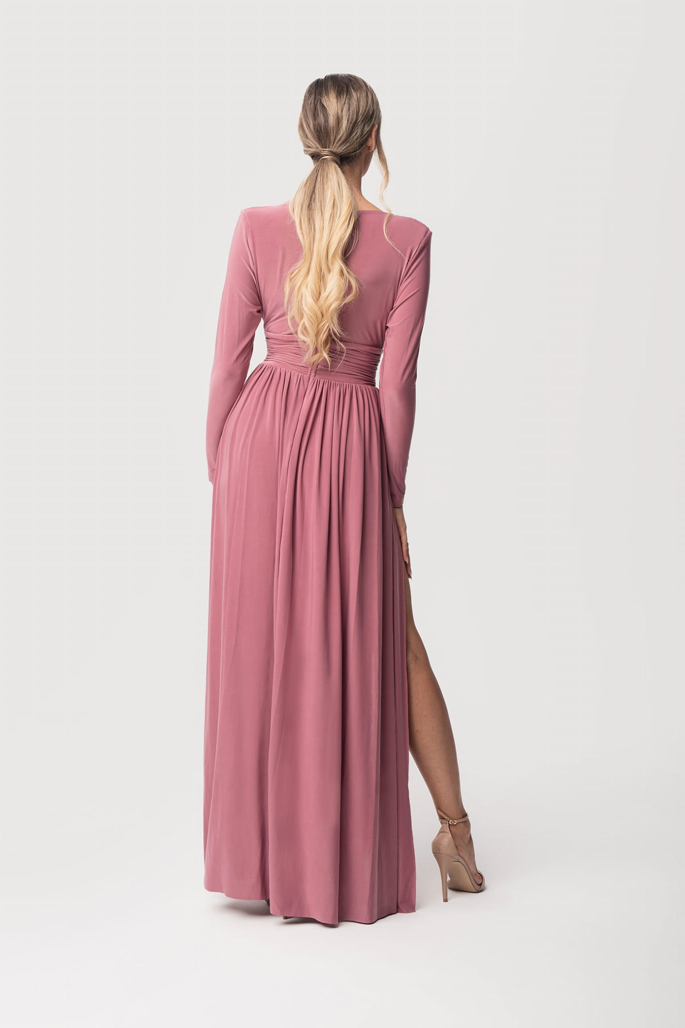 Sukienka o długości maxi, uszyta z przyjemnego w dotyku materiału. Głęboki dekolt i delikatne marszczenia tkaniny przepięknie podkreślają biust. Dodatkowym atutem jest pas, który efektownie zaznacza talię i wysmukla sylwetkę. W ramionach wszyte są poduszeczki, które dodają całości szykowności. Zmysłowe wycięcie odsłania i eksponuje nogę. Długi rękaw. Z tyłu zapinana na kryty zamek.