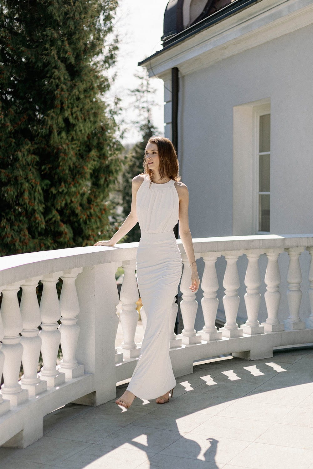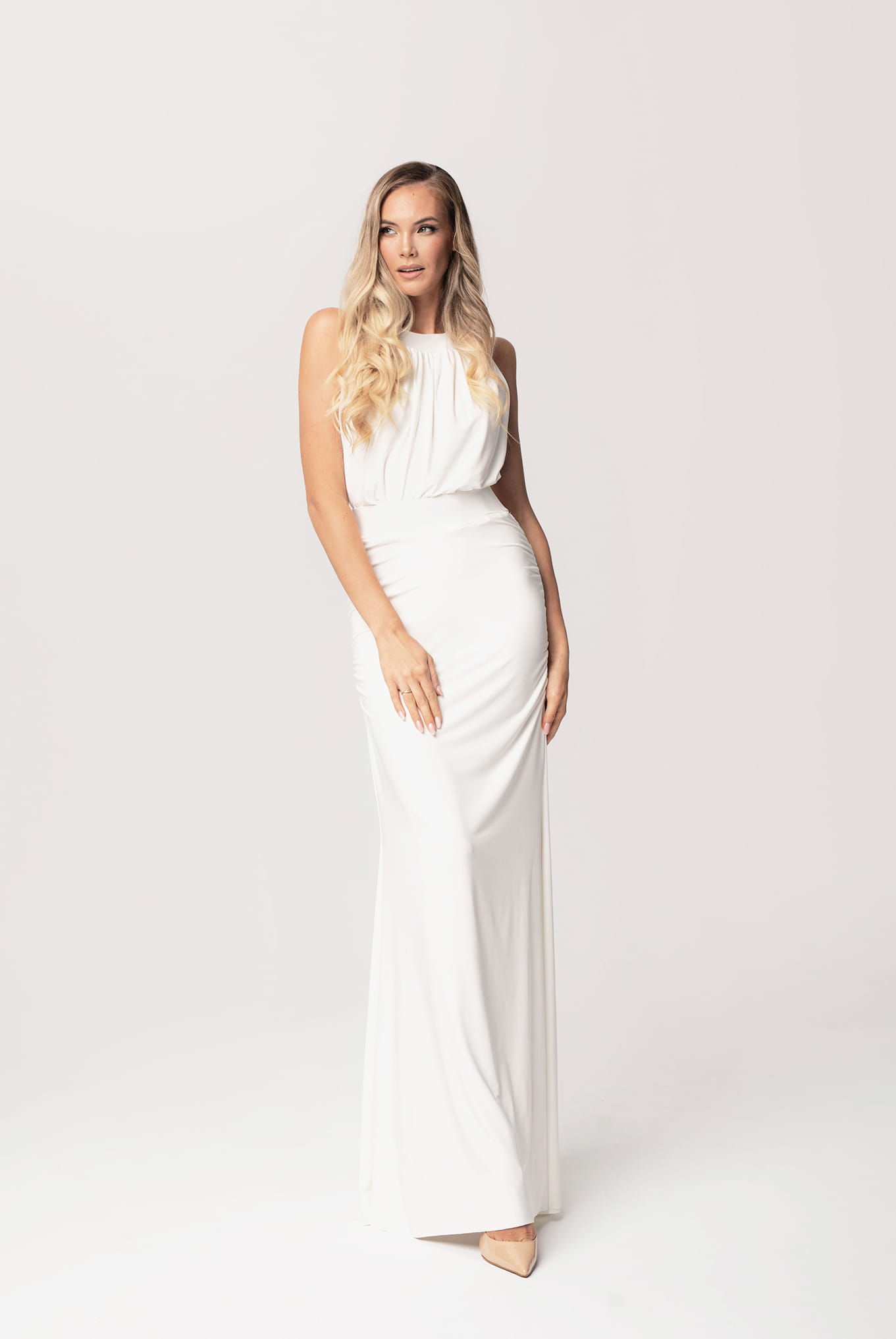 Modny dekolt halter i góra, która nie krępuje. Obcisły, lekko marszczony długi dół, który opina kobiece kształty.