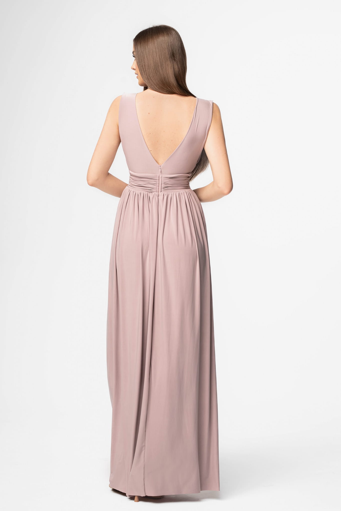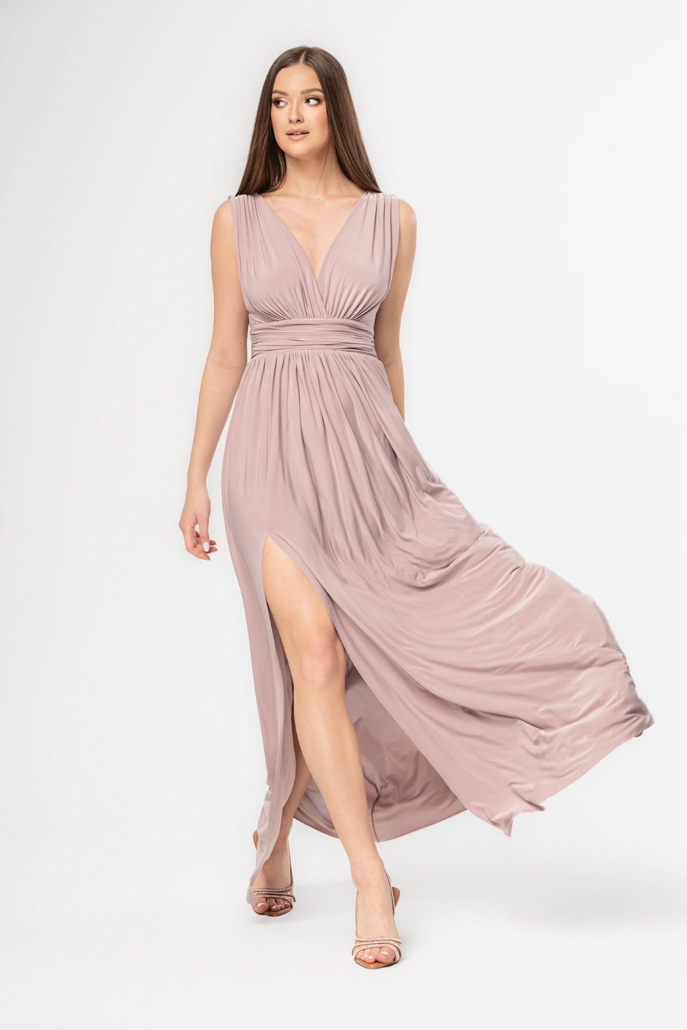 Suknia o długości maxi, uszyta z przyjemnego w dotyku materiału. Głęboki dekolt i delikatne marszczenia tkaniny przepięknie podkreślają biust. Dodatkowym atutem jest pas, który efektownie zaznacza talię i wysmukla sylwetkę. Zmysłowe wycięcie na plecach. Ponętne wycięcie odsłania i eksponuje nogę. Z tyłu zapinana na kryty zamek.
