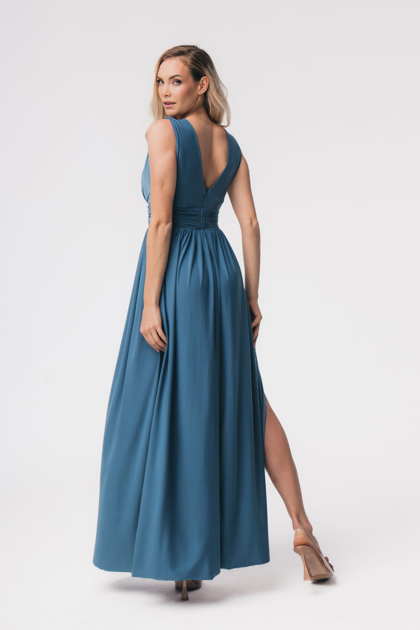 Suknia o długości maxi, uszyta z przyjemnego w dotyku materiału. Głęboki dekolt i delikatne marszczenia tkaniny przepięknie podkreślają biust. Dodatkowym atutem jest pas, który efektownie zaznacza talię i wysmukla sylwetkę. Zmysłowe wycięcie na plecach. Ponętne wycięcie odsłania i eksponuje nogę. Z tyłu zapinana na kryty zamek.