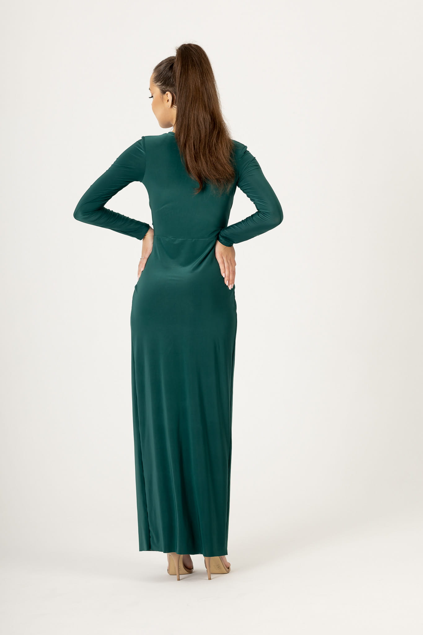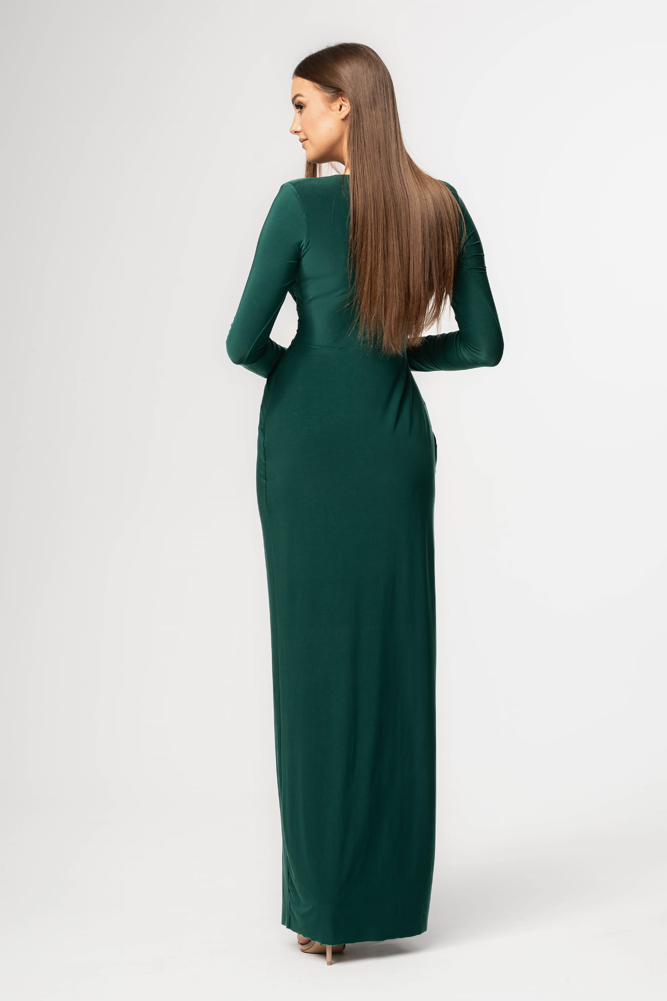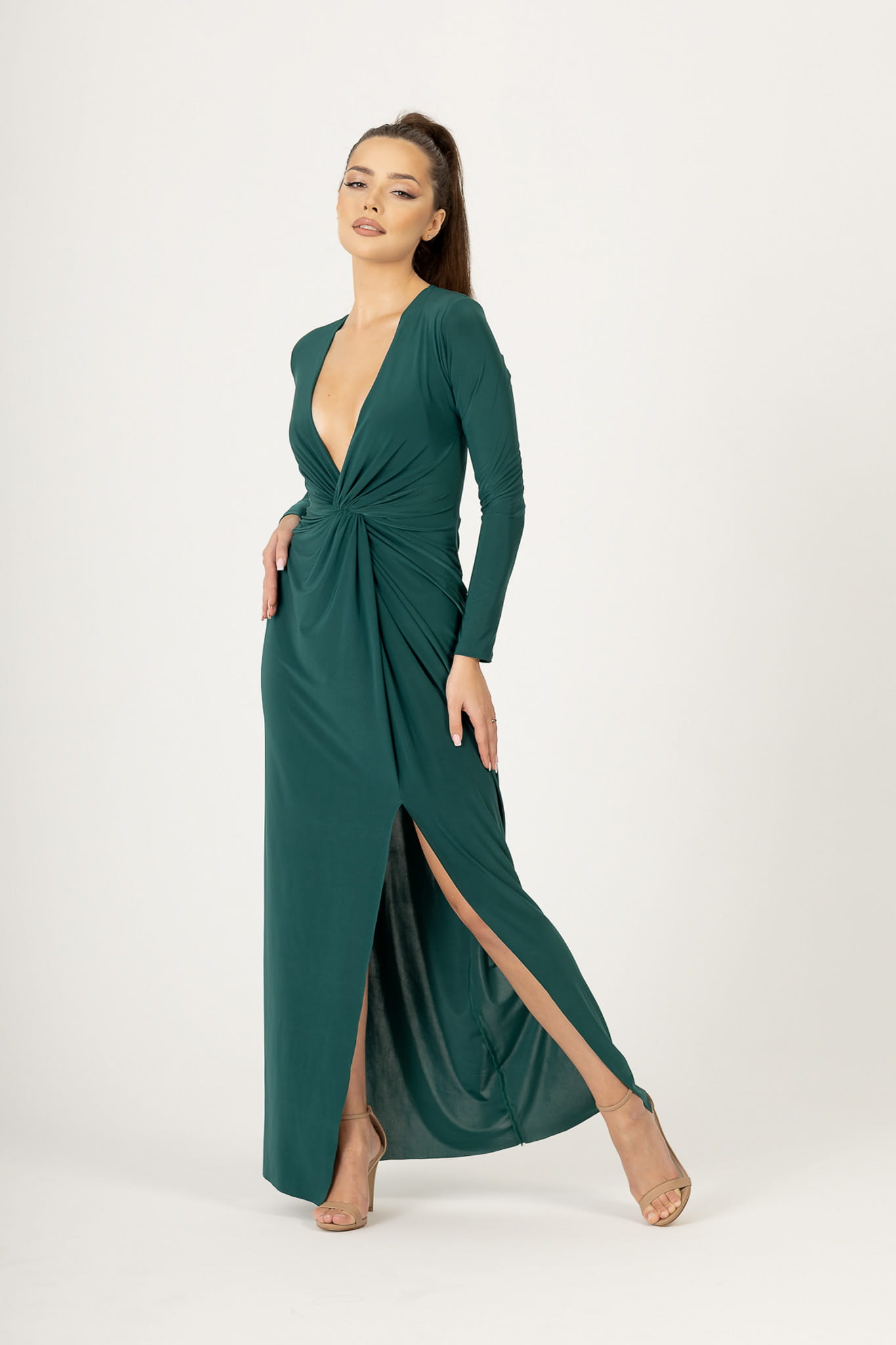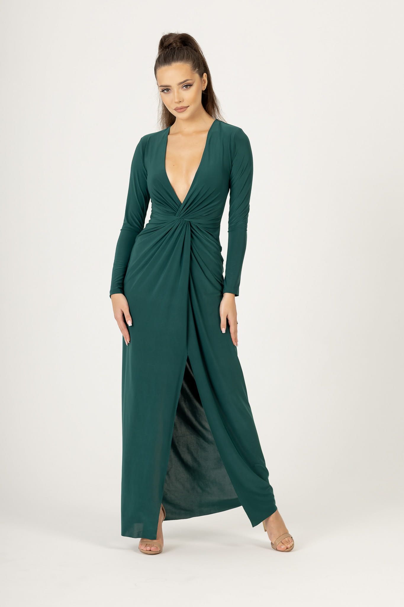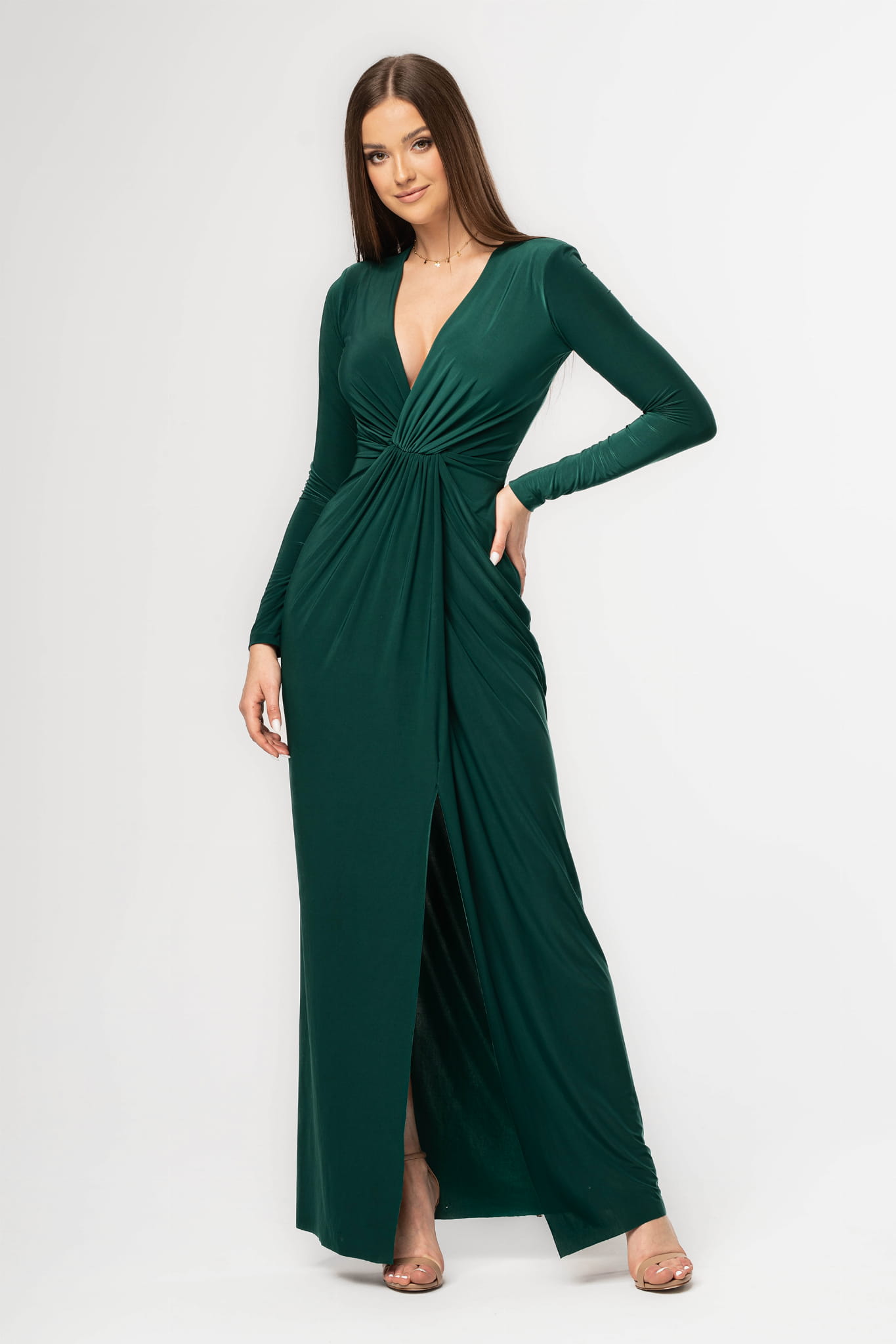 Sukienka o długości maxi, uszyta z przyjemnego w dotyku materiału z dekoltem typu V. Z przodu posiada ozdobny węzeł, który kryje niedoskonałości. Krój delikatnie opina sylwetkę, a zmysłowe rozcięcie w spódnicy odsłania i eksponuje nogi. Sukienka ma długie, obcisłe rękawy i wszyte poduszki na ramionach.