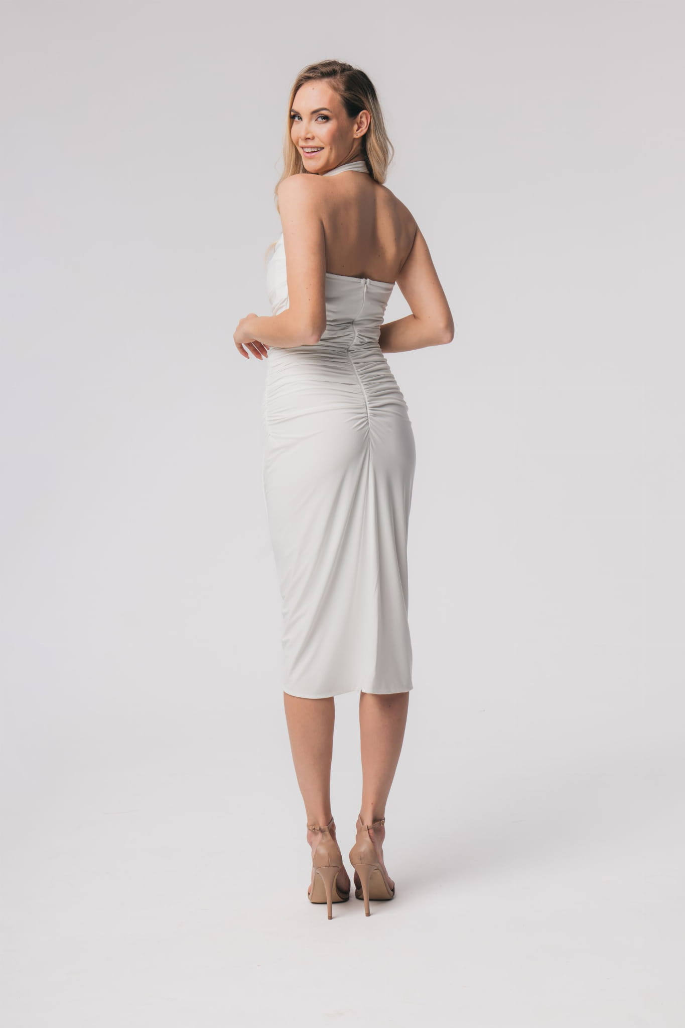 Delikatnie opina sylwetkę, dzięki czemu pięknie układa się na ciele, jednocześnie maskując drobne niedoskonałości. Marszczenia na sukience dodają jej niepowtarzalnego charakteru oraz pomagają w modelowaniu sylwetki, ukrywając ewentualne mankamenty. Długość midi sprawia, że sukienka jest stylowa i zmysłowa, a jednocześnie odpowiednia na różne okazje. Jej nietuzinkowy design z pewnością przyciągnie wzrok i sprawi, że poczujesz się wyjątkowo.