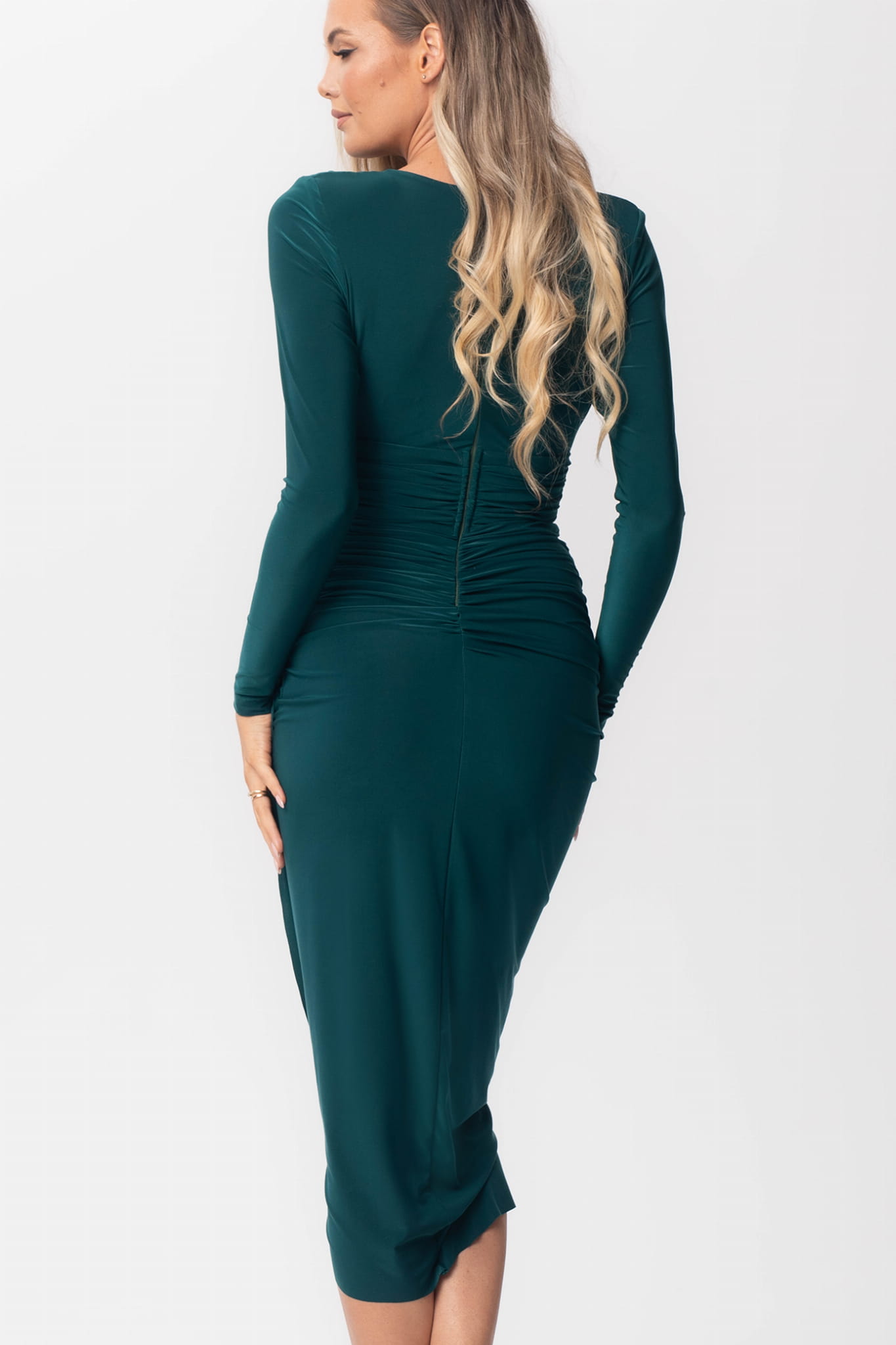 Delikatne marszczenia nadają sukience unikalny charakter, tworząc subtelny, ale efektowny detal. Głęboki dekolt dodaje nuty zmysłowości, pozostawiając miejsce dla wyrafinowanych dodatków lub biżuterii, które uzupełnią Twój elegancki look.